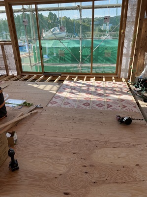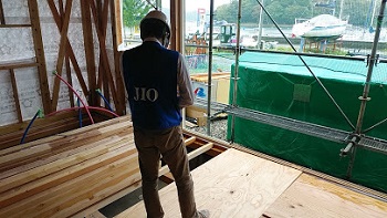 床下断熱材とフロアー下地材の取り付けが始まっています。隙間なく大工さんが丁寧に作業を行っています。