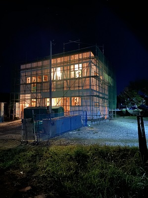 工事も大詰めとなりました。日没後も職人さんが工事を行っており、幻想的な雰囲気になっていました。