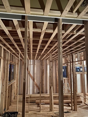 天井下地材、間柱の取り付けが着々と進んでいます。材料搬入、取り付け、また搬入・・・を繰り返し工事が進んでいきます。