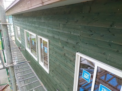 外壁の下見板が着々と施工されております。今週には貼り終えて、次週コーキング工事になります。