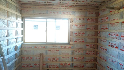 二階の壁下地の施工が進んでいます。細かな間隔にしてボードが安定するようにしています。