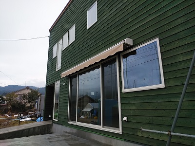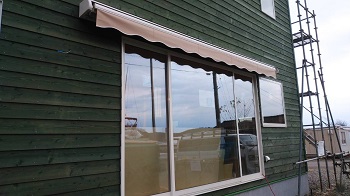 お客様工事のオーニングが取り付けられました。横幅4mオーバー。風にも負けないように壁内部の下地が沢山入ってます。
