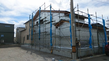 外壁工事が始まり、土台に水切りが施工されました。軒裏の工事も始まっております。工務部 竹端