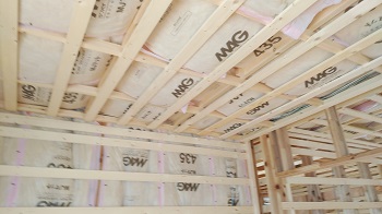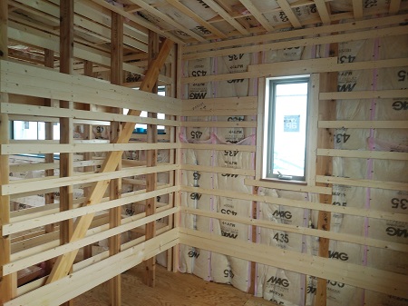 2階の天井と壁に断熱材が入りました。寒さ暑さから守ってくれます。工務部 竹端