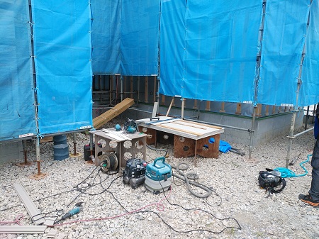 中庭の立ち上がりコンの下準備が進められています。天気も良く、順調に進んでいます。工務部 竹端