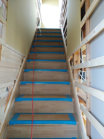 玄関ホールの天井仕上材のベニヤが施工されました。本日は階段も施工されています。工務部 竹端