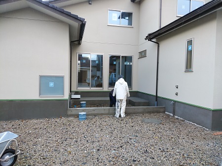 塗装工事がもうすぐ終わり、クロス工事へと進んでいきます。外構も天気と相談しながら施工を進めていきます。工務部 竹端