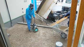 本日は雨の中、外構工事を行いました。中庭に砕石をランマ―によって転圧しました。工務部 竹端