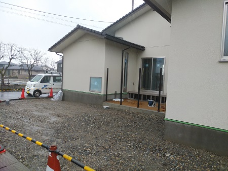足場が解体され建物が露わになりました。外構工事も平行に進めていきます。工務部 竹端