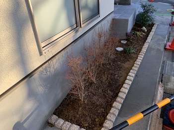 お施主様工事の花壇内部に本日植樹がされました。玄関が華やかになりました。工務部 竹端