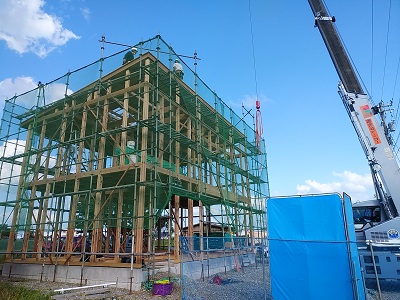 本日よりRoki☆さまのライブ中継を開始いたします。完成、お引き渡しまでお付き合いをお願いいたします。 さて、昨日は上棟でした。朝方の雨も早い時間に上がり、晴天の中工事を進めることができました。