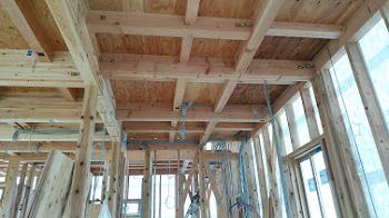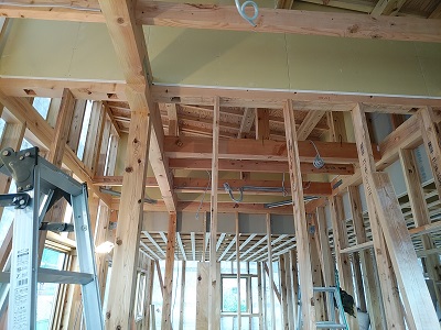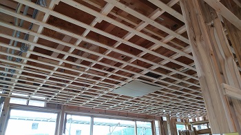 天井下地材、間柱の取り付けが着々と進んでいます。材料搬入、取り付け、また搬入・・・を繰り返し工事が進んでいきます。