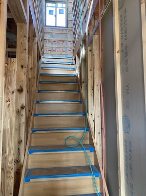 二階に上がる階段の取り付けが完了しました。職人さんの移動の手間が一つ減りました!