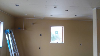 日々大工さんの工事が進んでいます。今回建築している建物の性格上、天井裏の見えないところにも壁を作っております。細かく見ると、ボードが二重貼りされています。