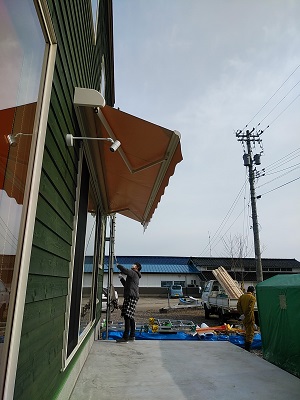 お客様工事のオーニングが取り付けられました。横幅4mオーバー。風にも負けないように壁内部の下地が沢山入ってます。