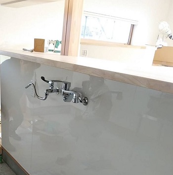 厨房内にカランが施工されました。 ピカピカに輝いています。 本日は、お昼過ぎに七尾市役所による 完了検査が行われます。