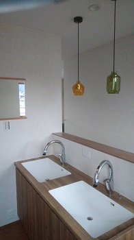 階段下の洗面化粧台のカウンターが取り付けられました。上の陶器は、これからの取り付けとなります。