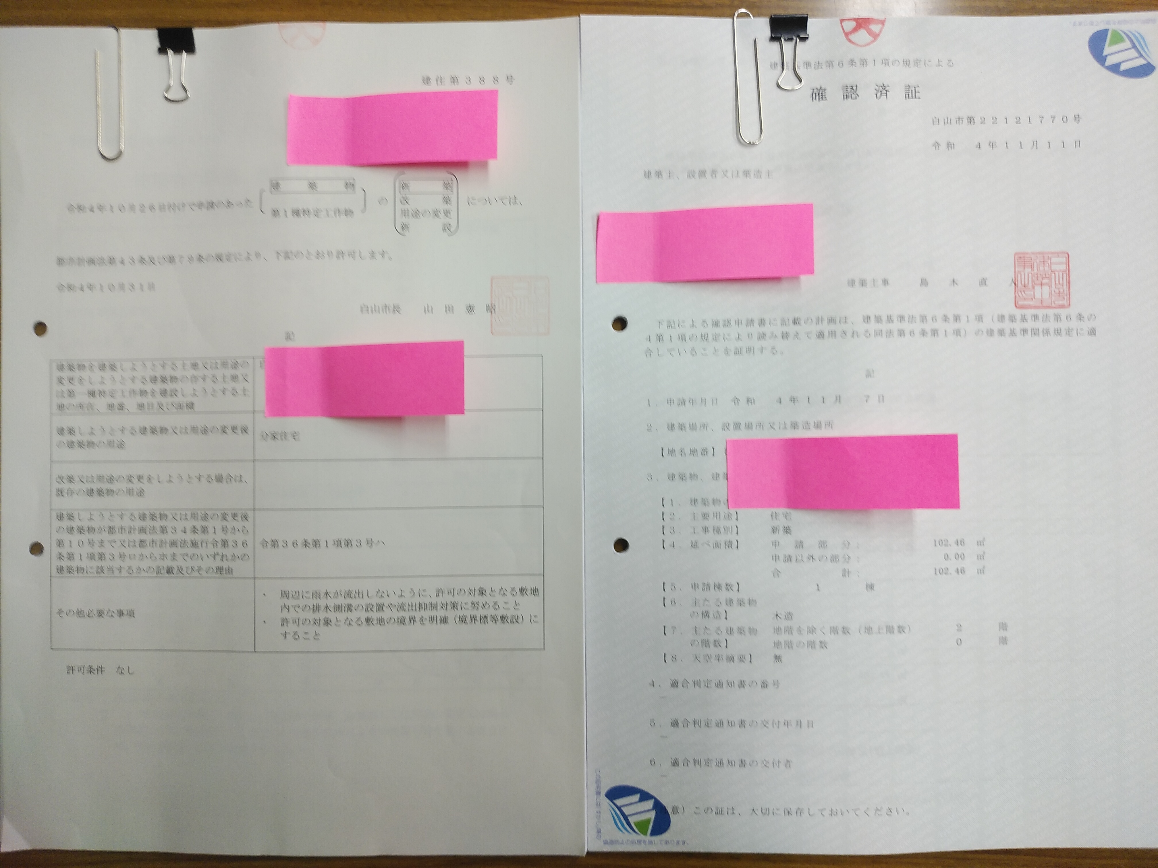 建築物の工事には事前の申請が必要になってきます。 画像はぶどう様のお家を建築するにあたり、市役所から許可がでた証です。 12月の着工を予定しております。 いましばらくお待ちください。