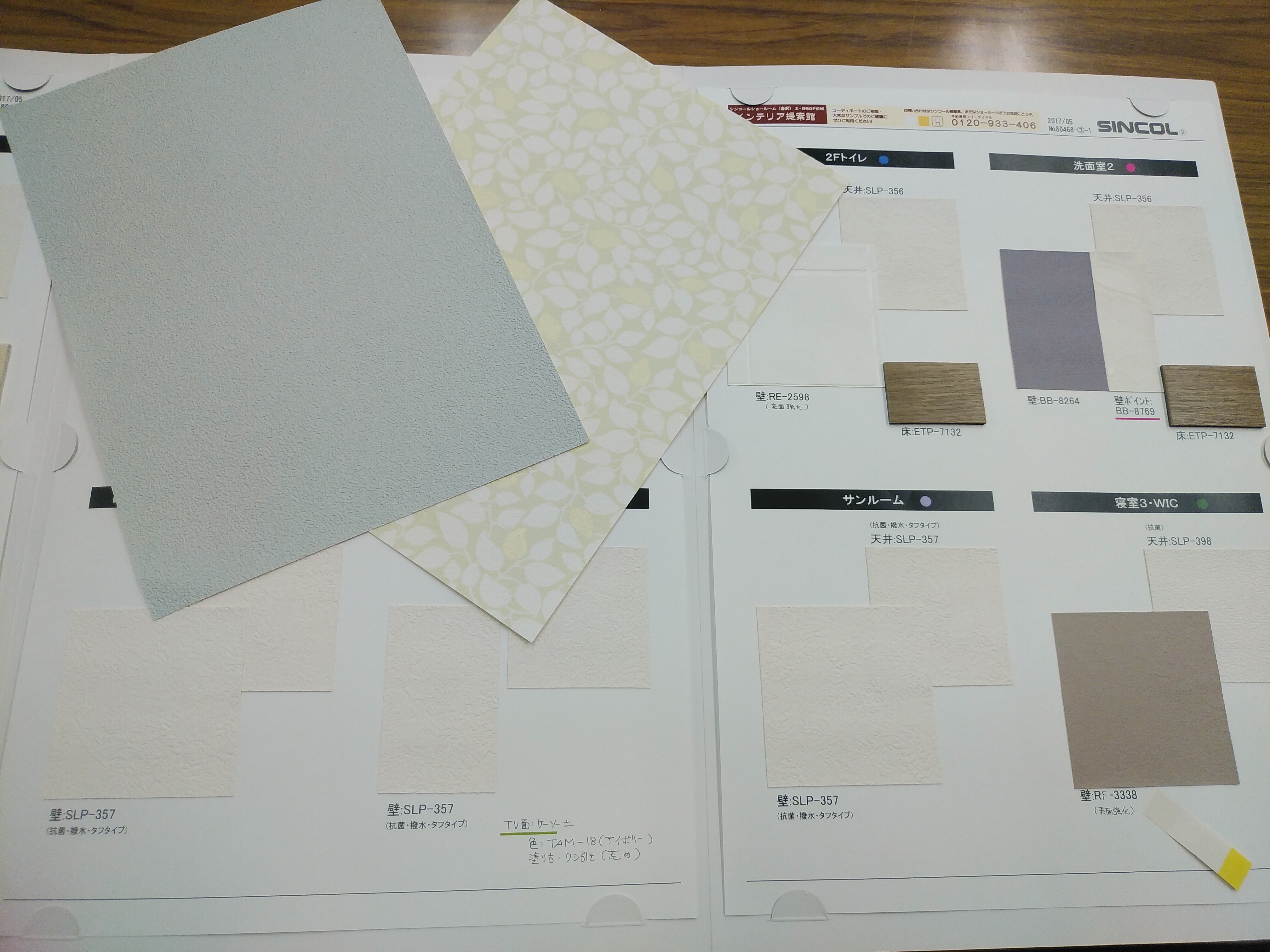 契約後、着工までの間に仕上げに関する打合せを行っていきます。 画像は各お部屋の壁や天井のクロスのプレゼンボードになります。 クロス一つでお部屋の印象が随分と変わってくるので、慎重に打合せを進めさせていただいています。