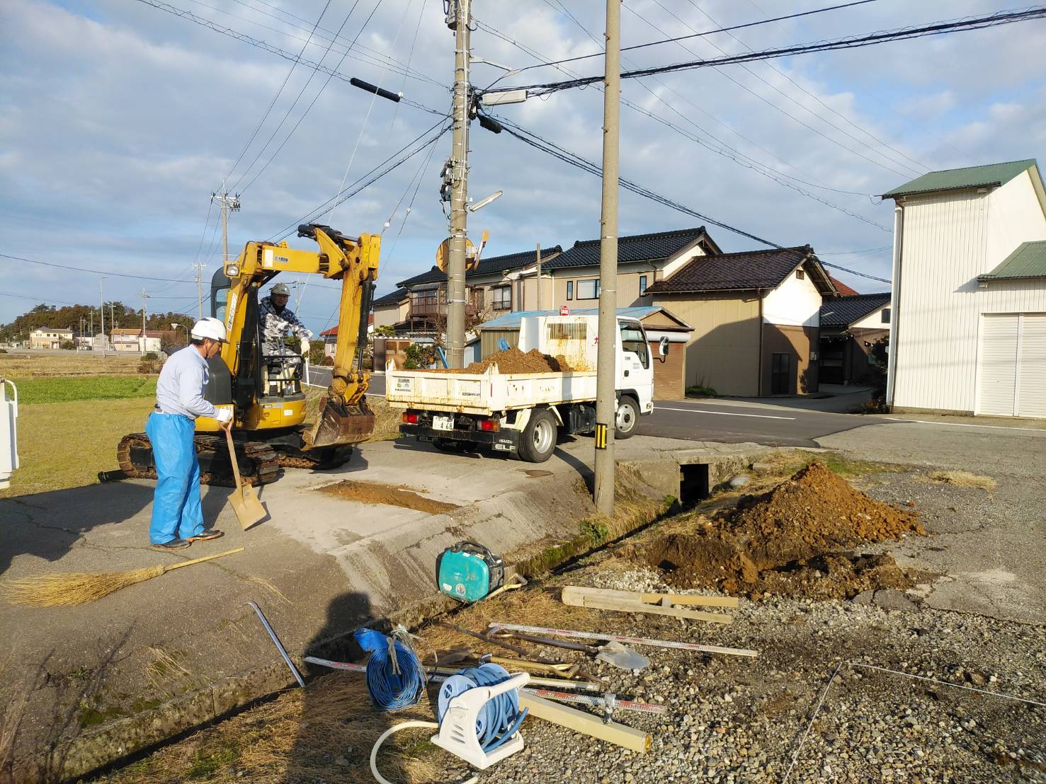 来週の着工に向けて、本日朝より建設地の水道引込工事を実施しております。重機を使って公道地下にある本管を探しあてておりました。