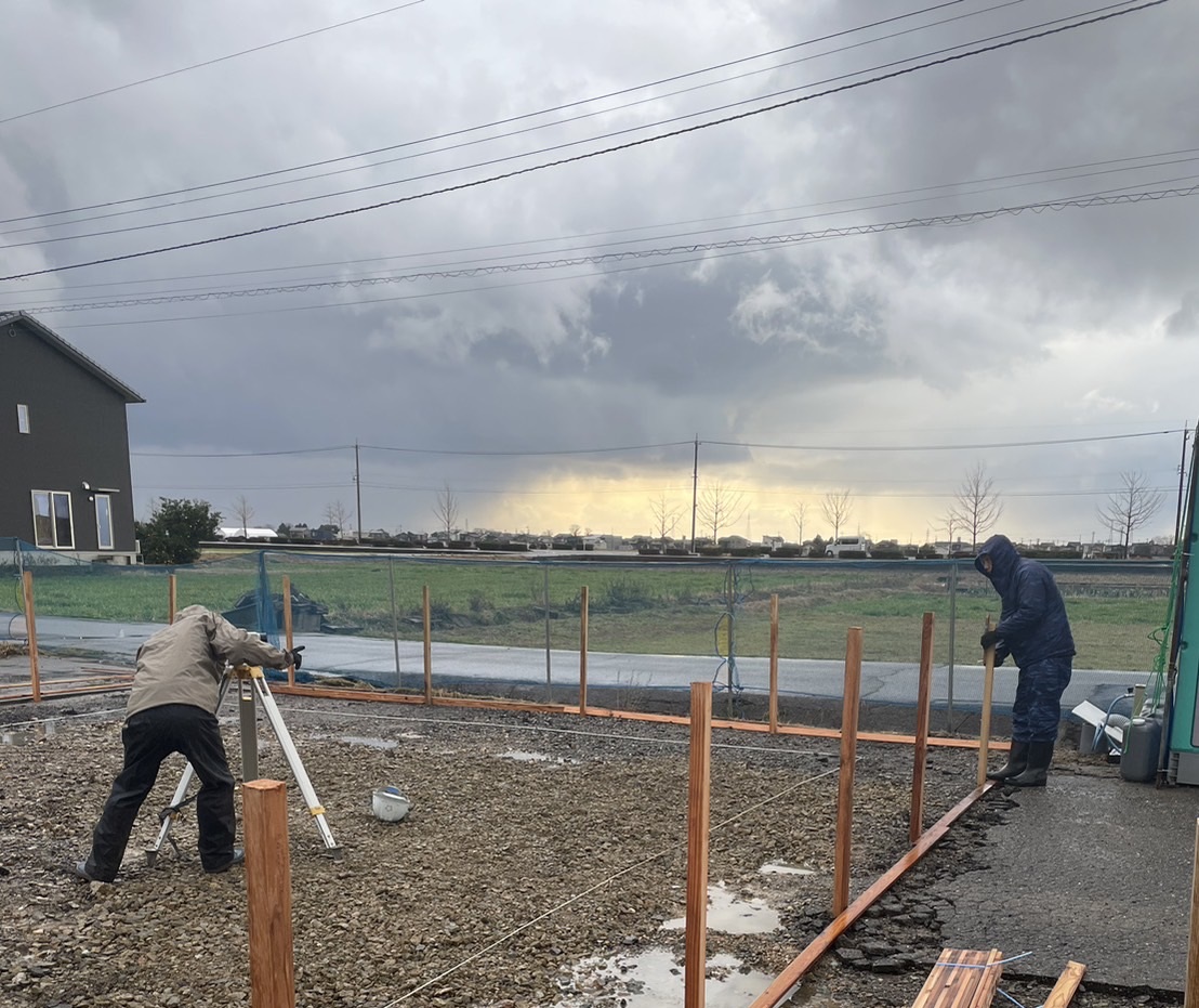 基礎着工までもう少しとなりました。 建物の位置を決める丁張り作業から開始となります。