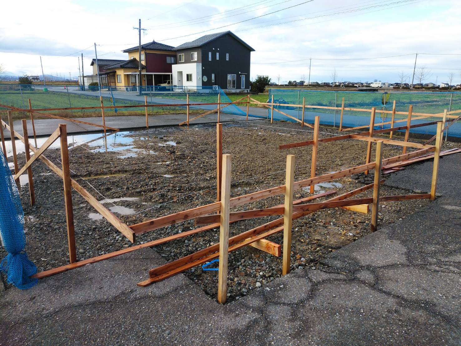 本日より着工いたしました。 仮設トイレ、仮囲いの設置が完了し、丁張り作業を行いました。