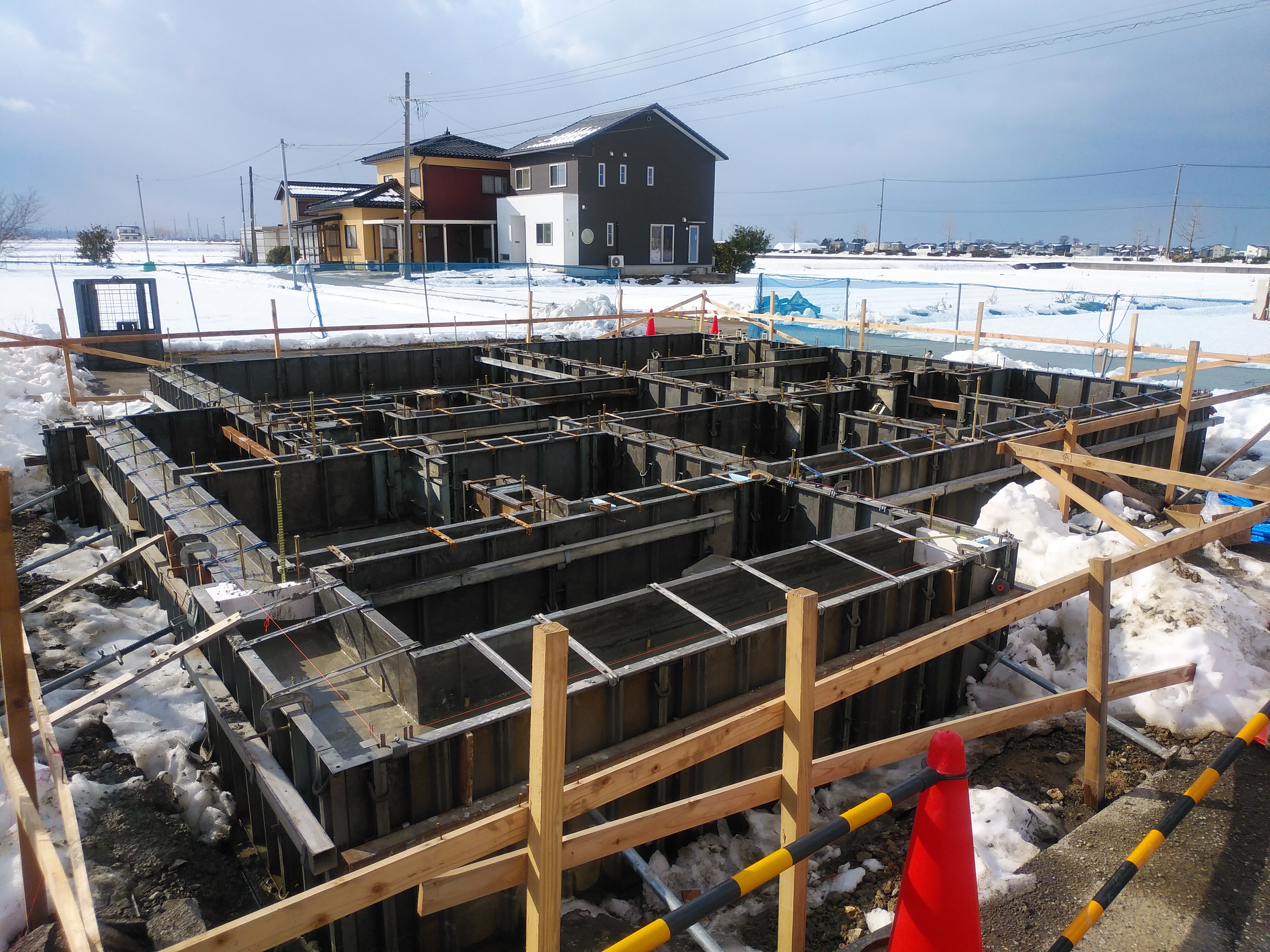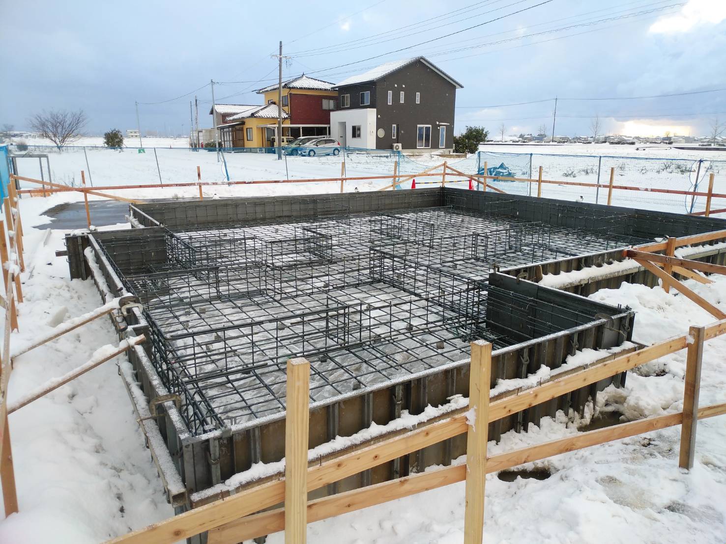 心配していた雪も大事に至らず、本日基礎の配筋工事を行いました。 明後日には専門機関の検査を受け、コンクリート打設工事に移ってていきます。