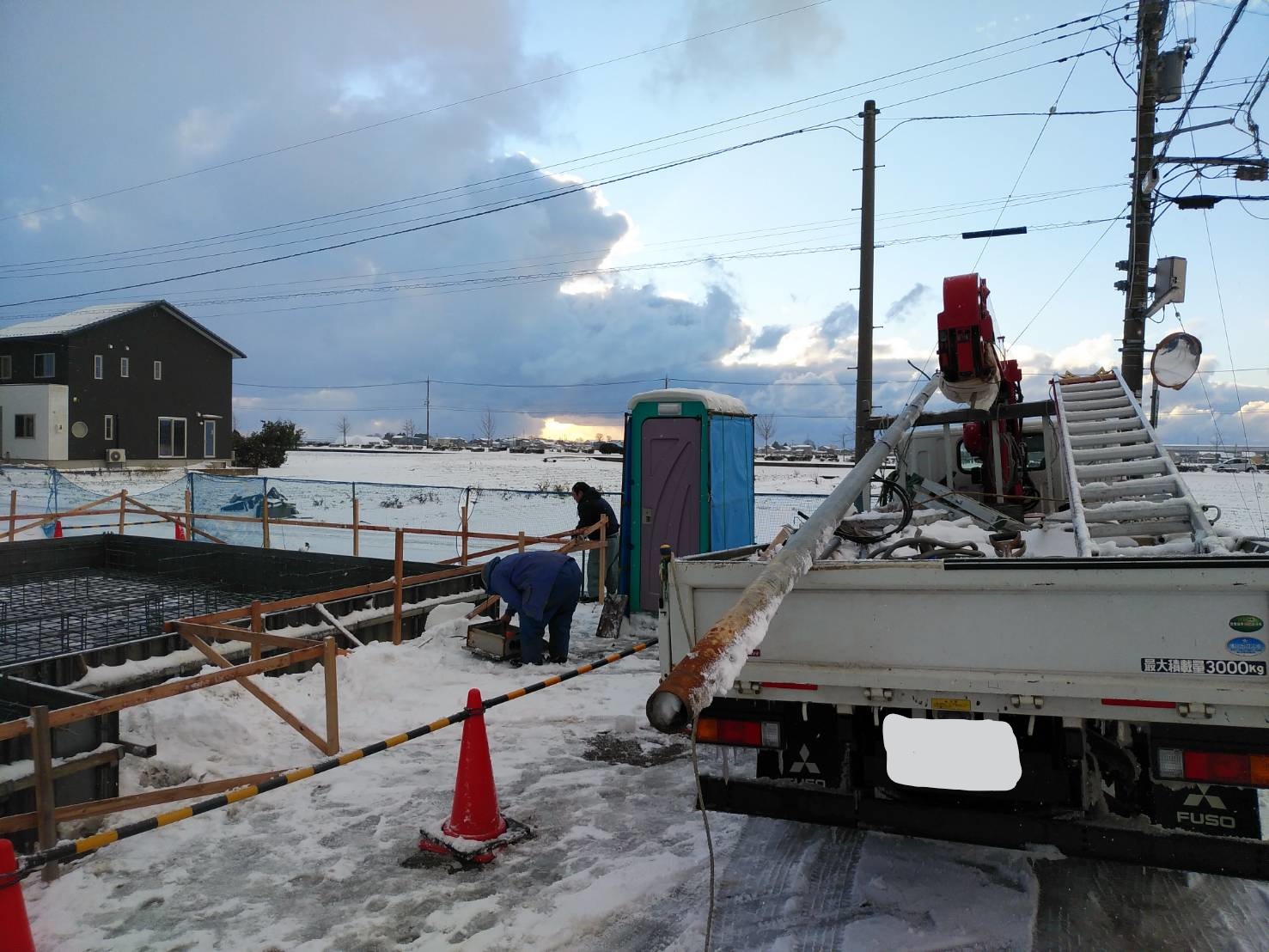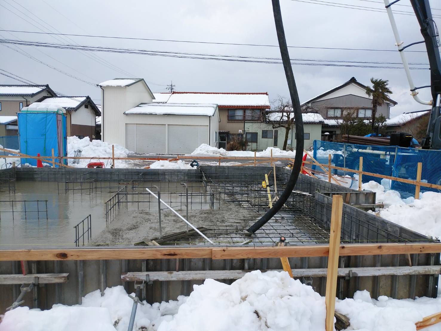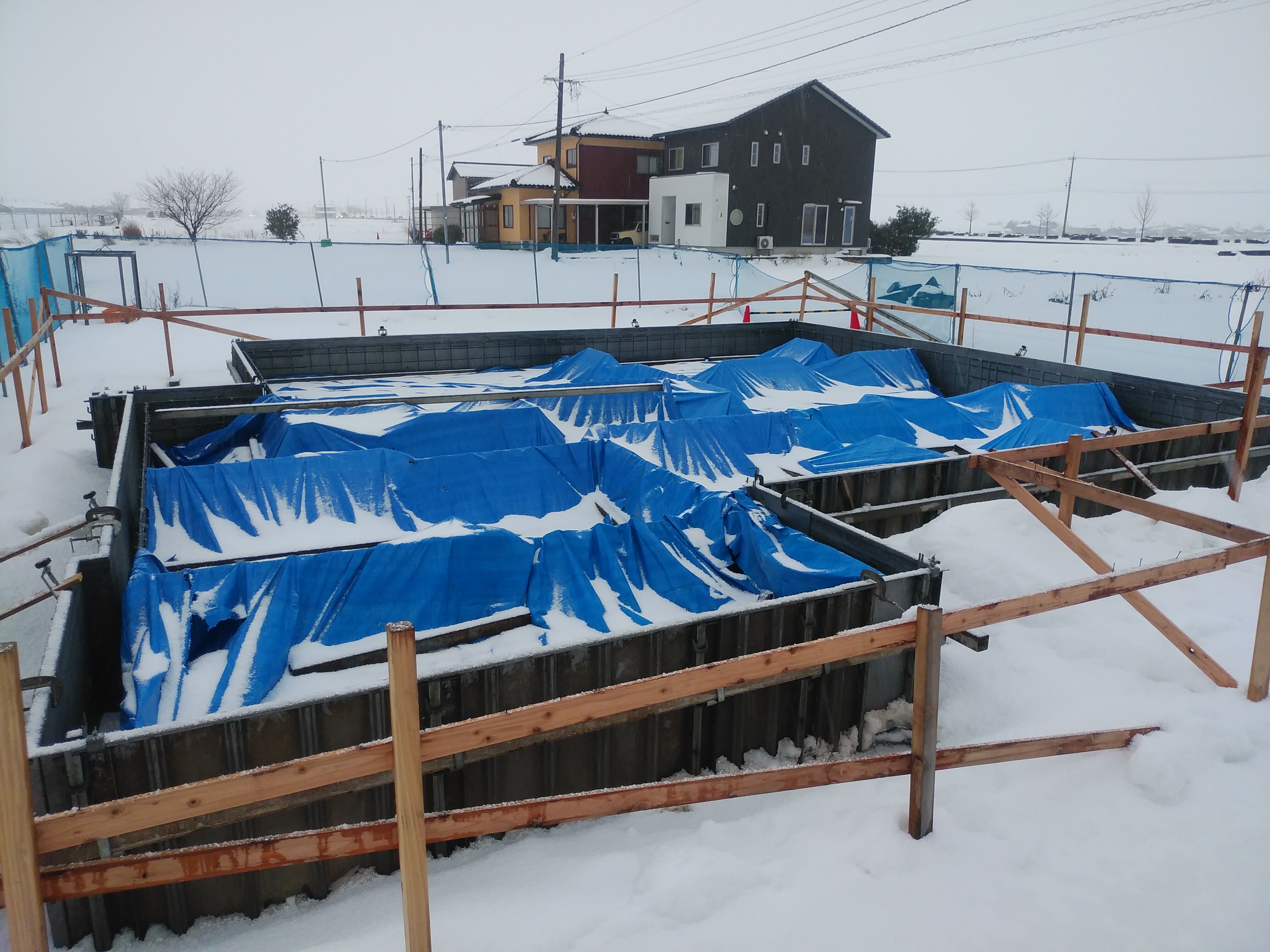 基礎の鉄筋が組まれました。 現在、雪よけのためのシート養生を施しております。