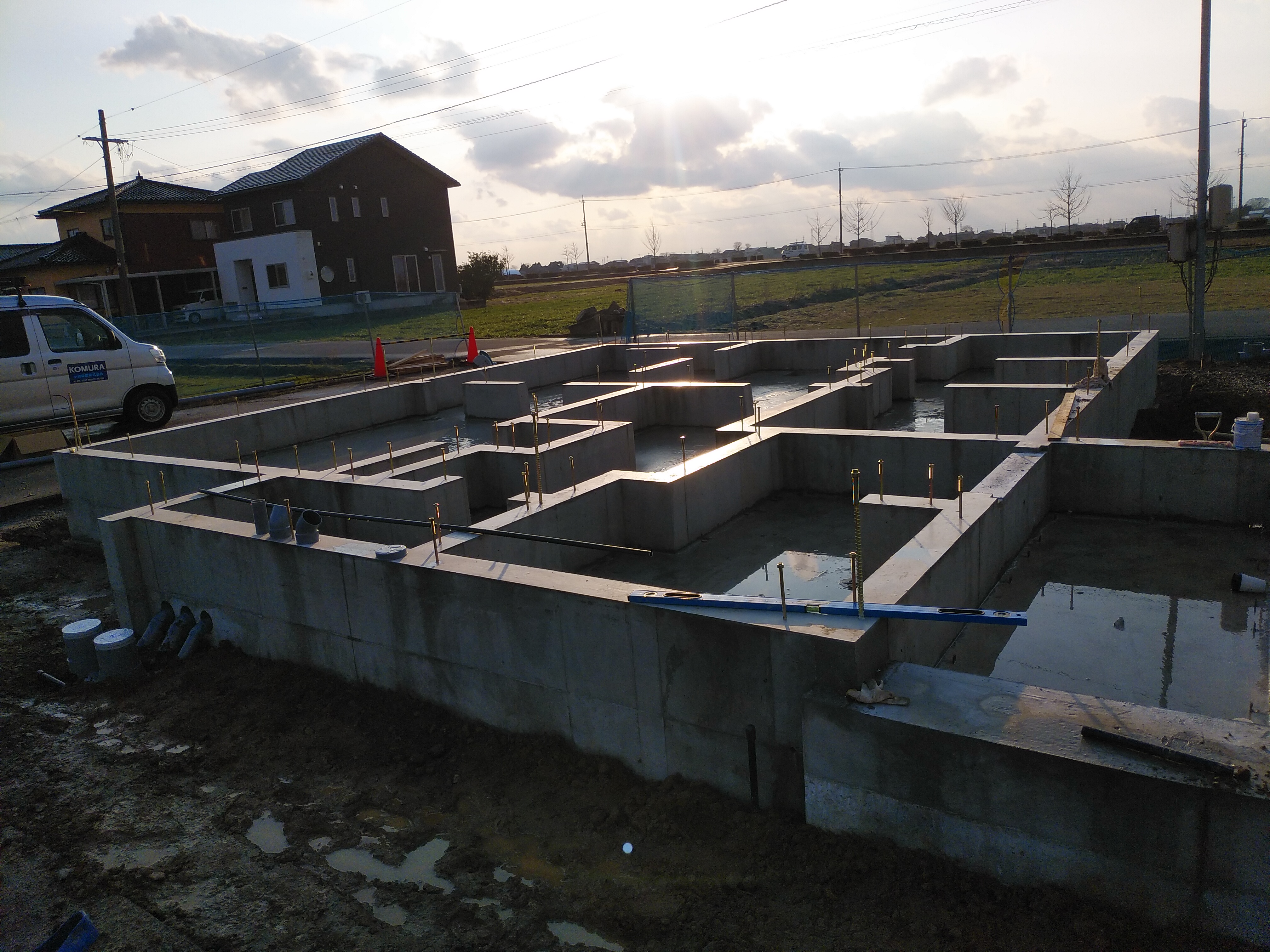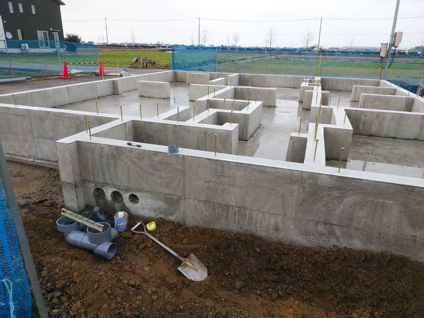 立ち上がり部のコンクリートの施工が終わり、現在は固まるまでの養生期間となります。