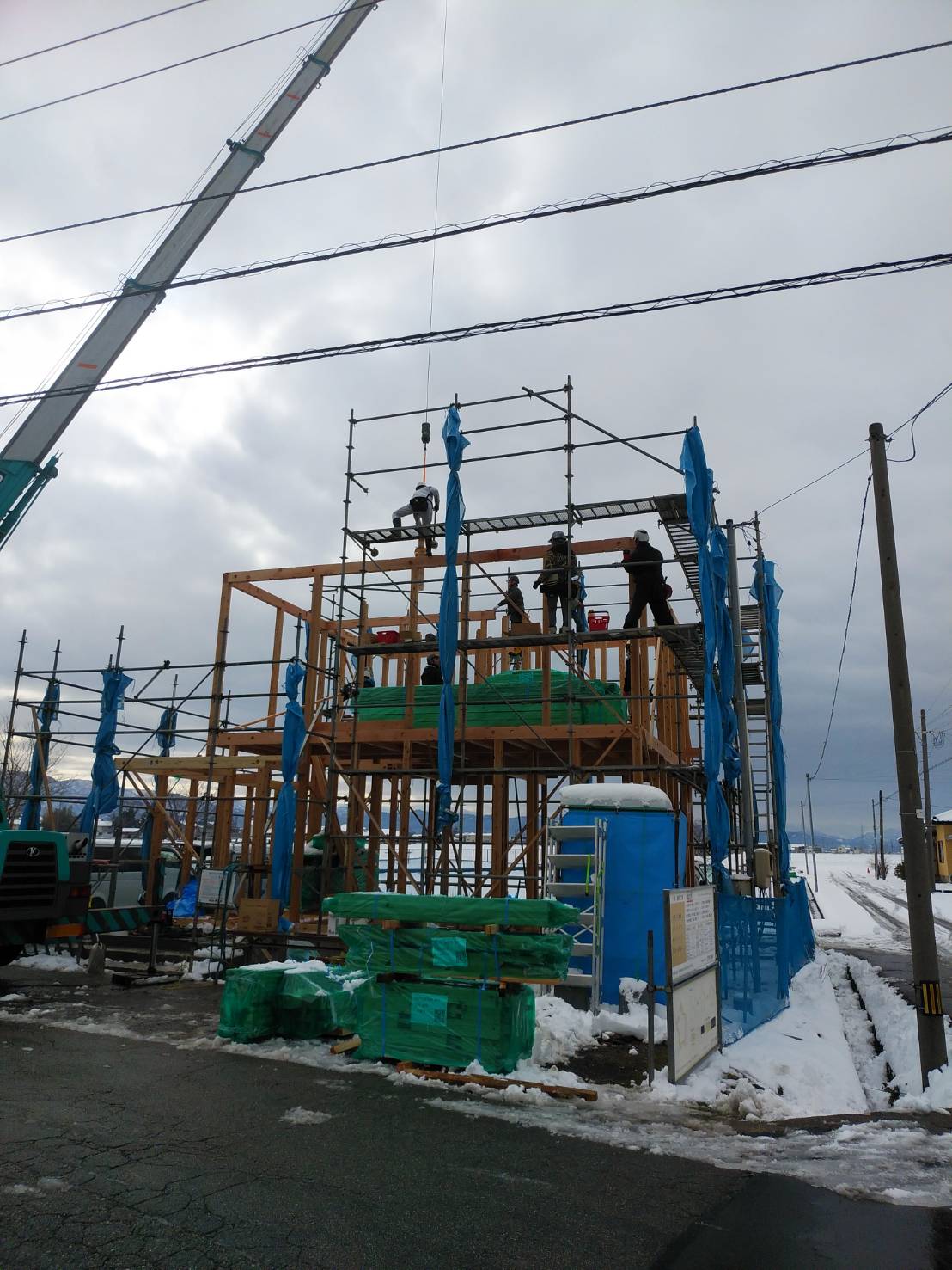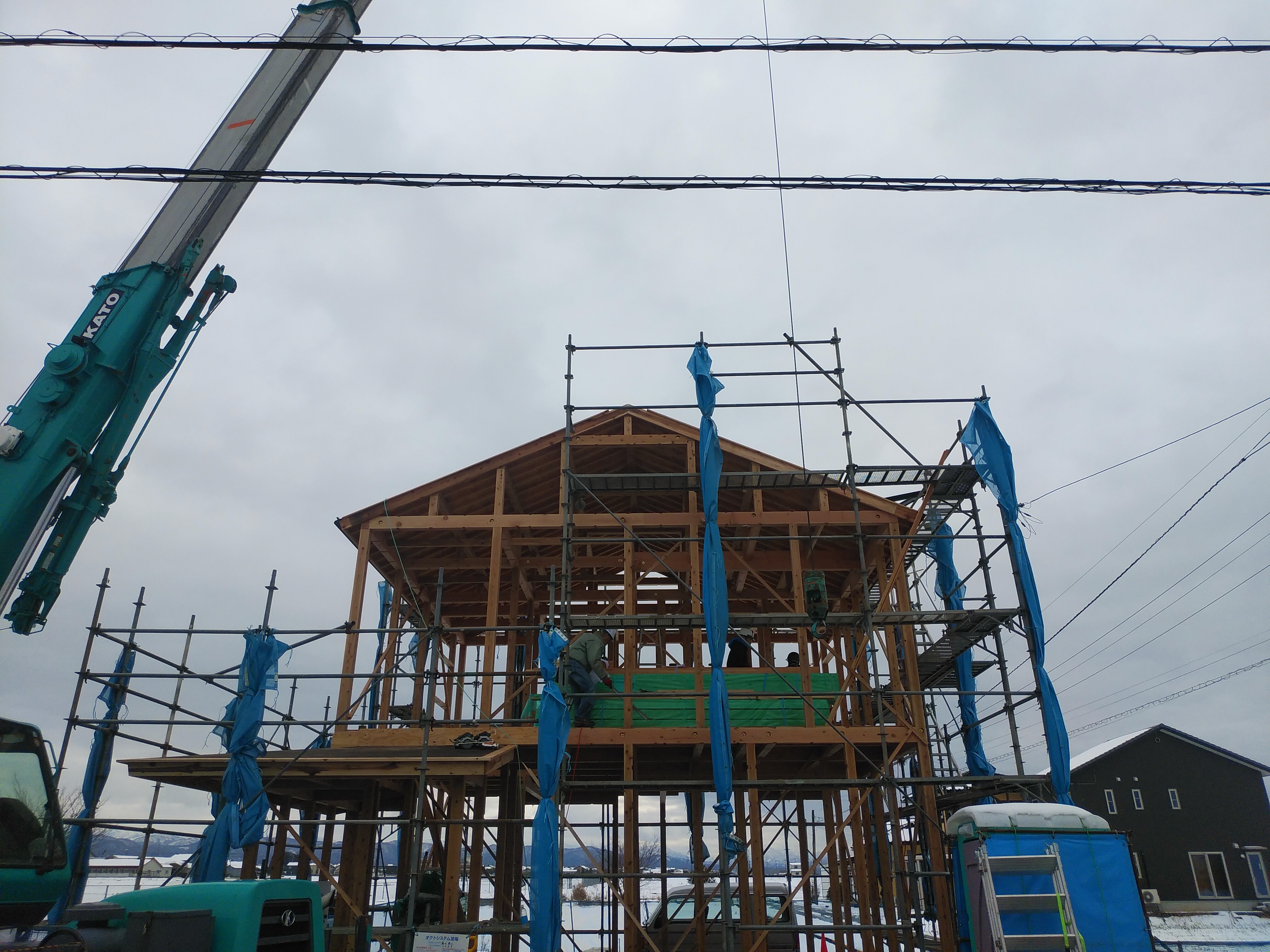 ぶどう様 こんにちは! 本日は待ちに待った上棟です。 昨日降った雪が心配でしたが、朝から無事に大工さんの作業を始まりました 夕方には屋根までの作業が完了し全体像が見えてきます。 お楽しみになさってください。