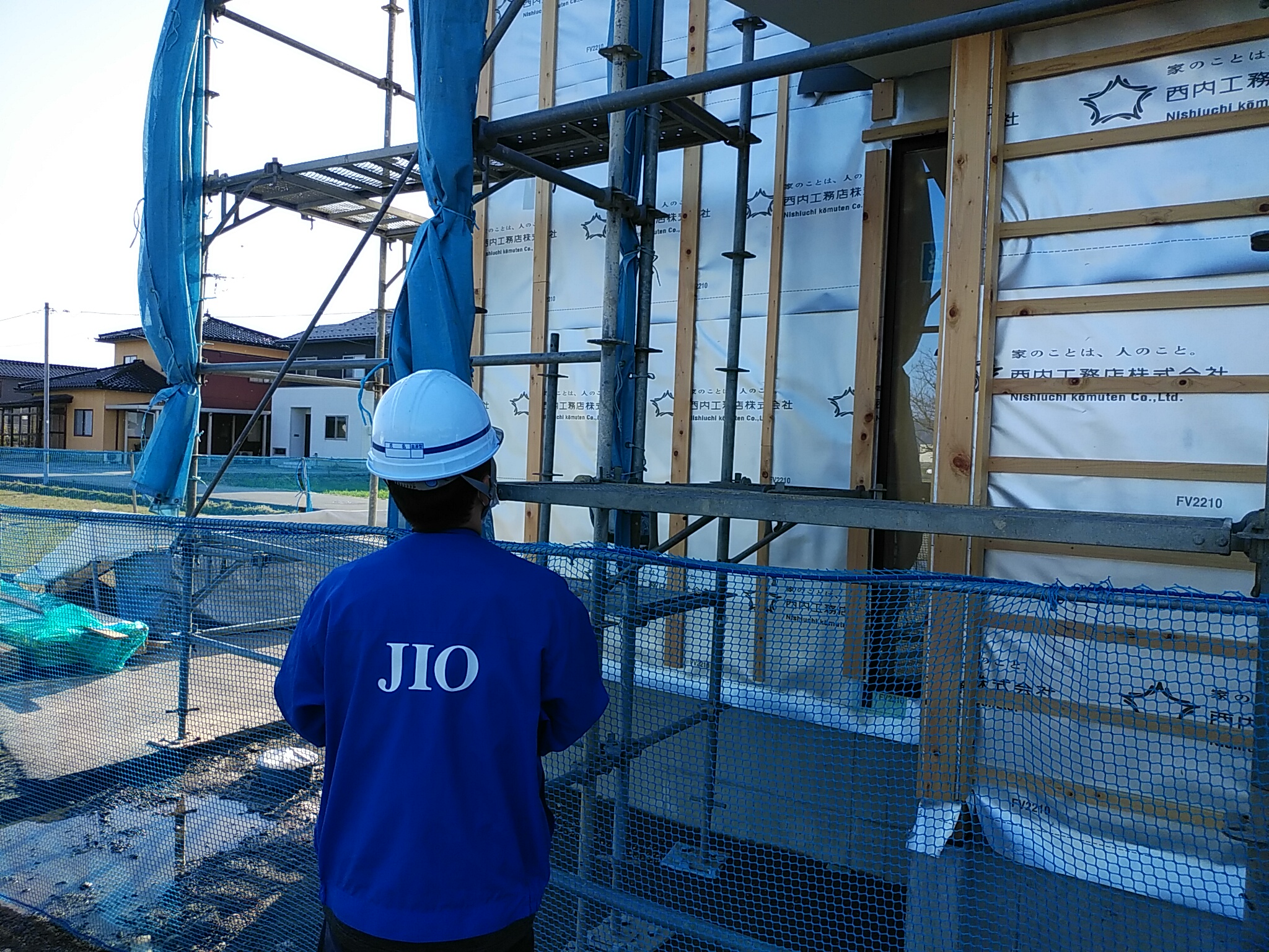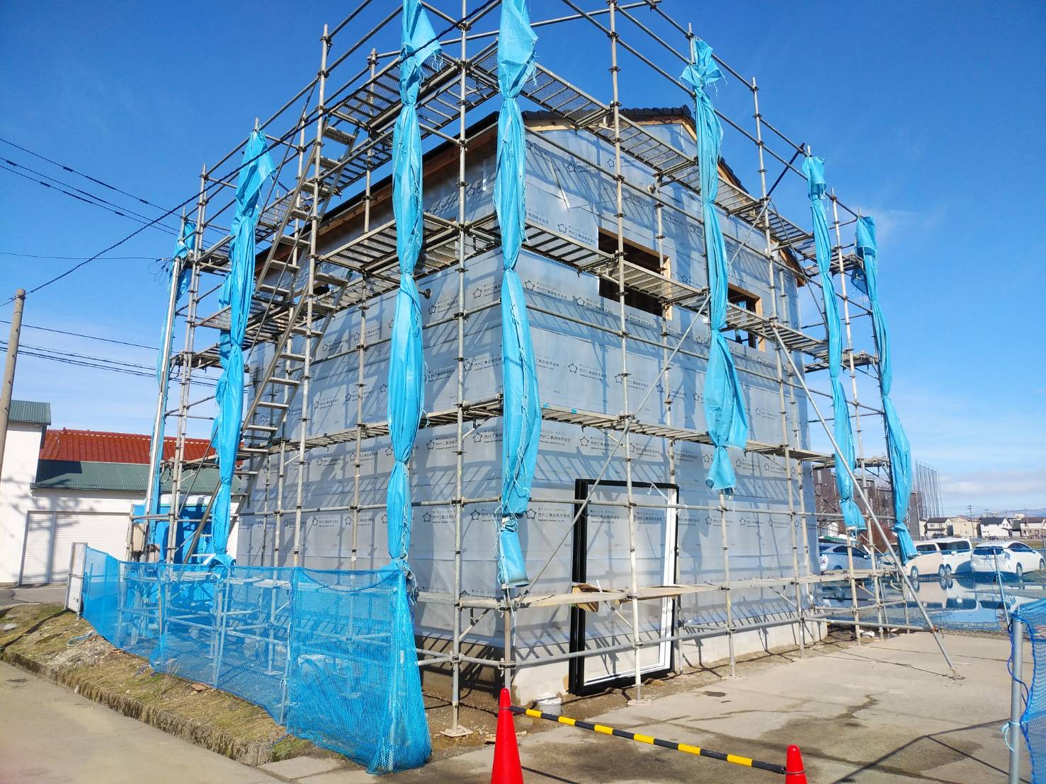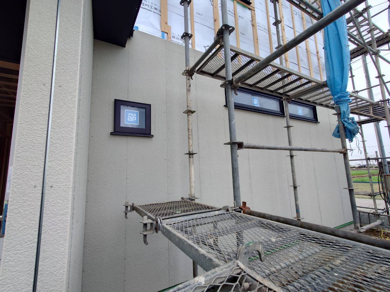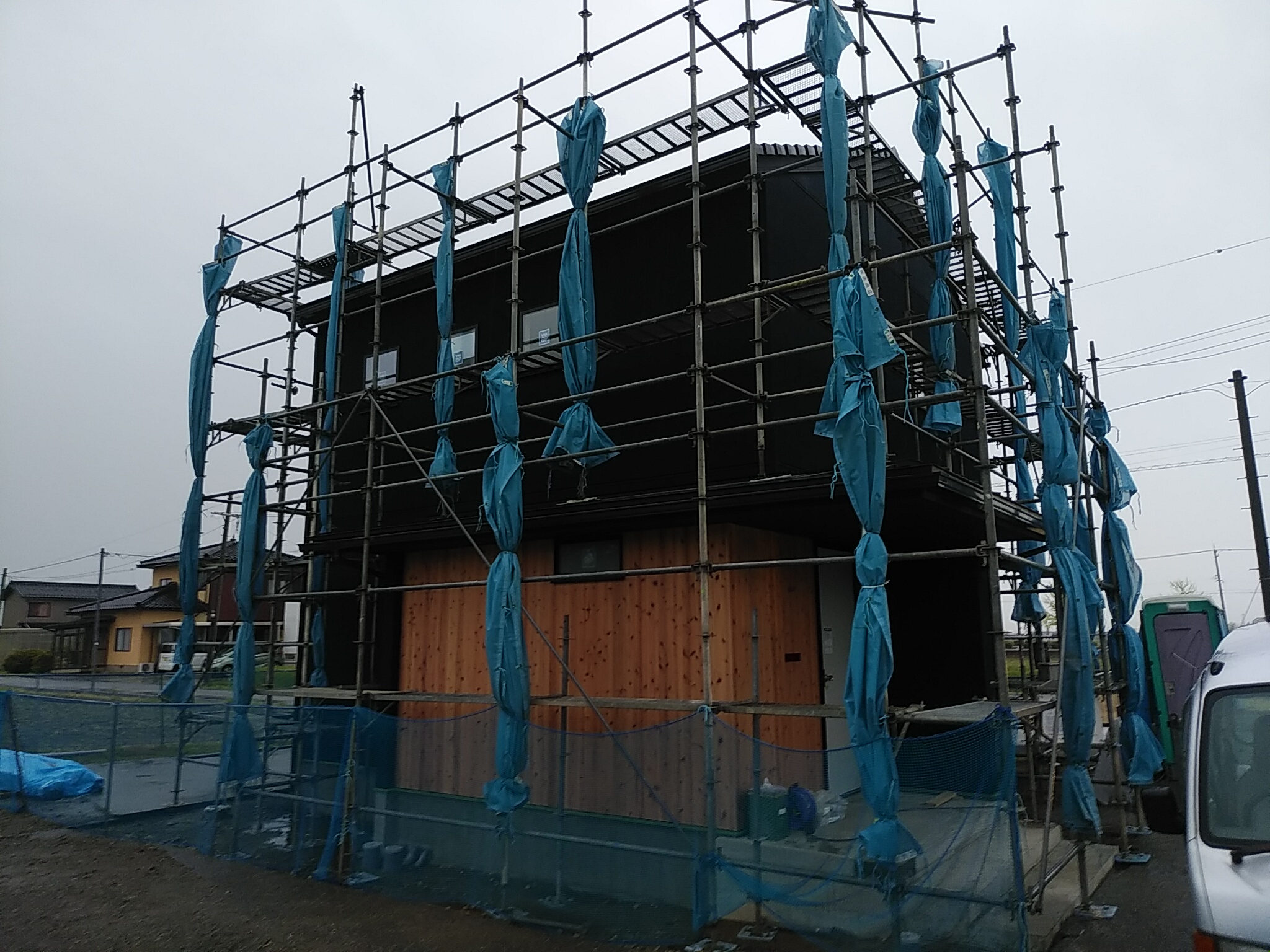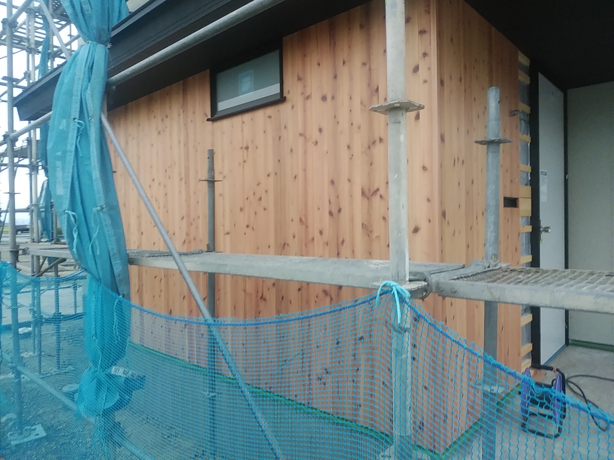 建物の周囲に通気シートが張られました! これで、外からの雨風もしのげます!!
