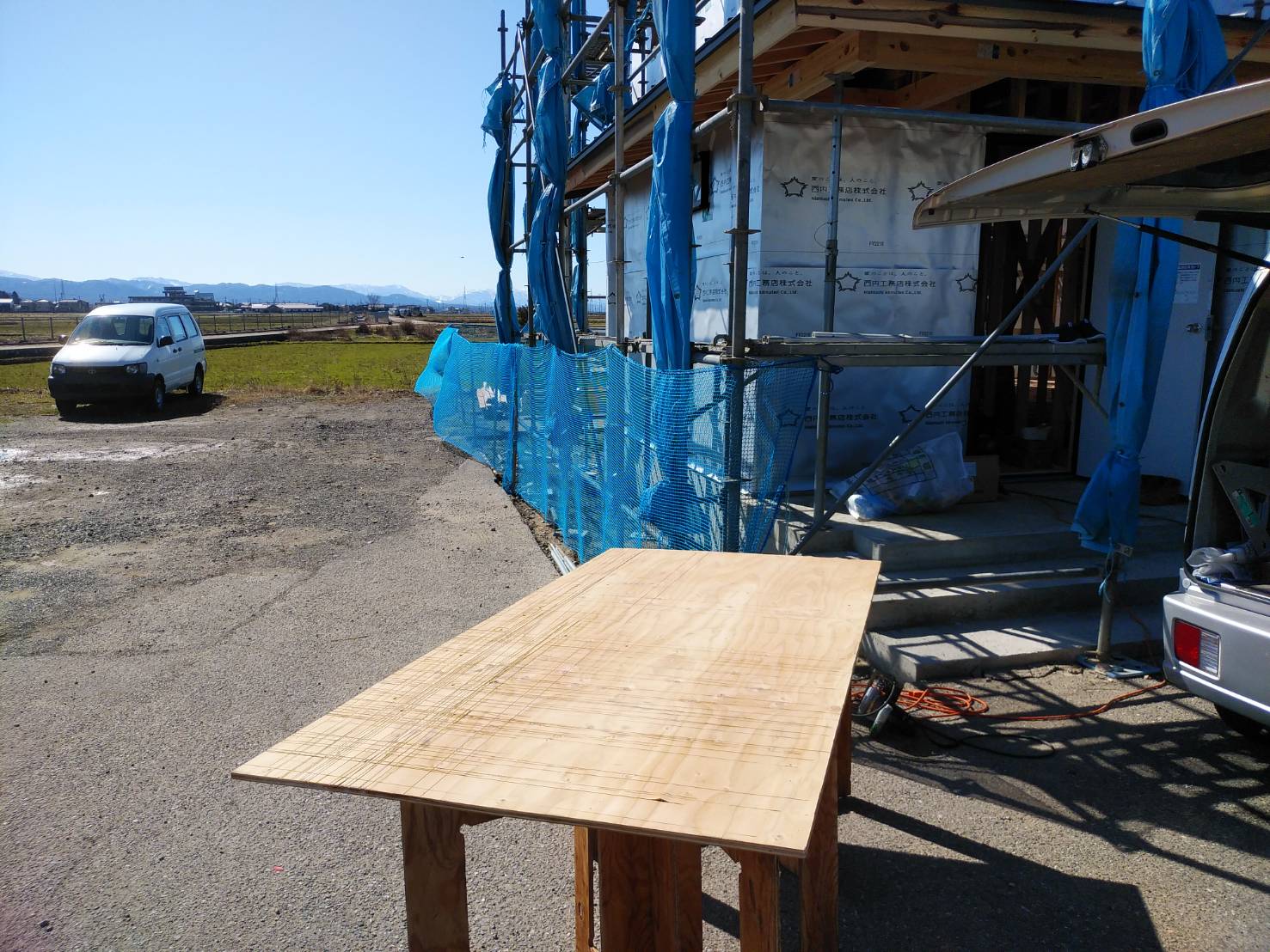 本日は安全パトロールを実施いたしました。危険な場所、汚れた場所がないかを厳しくチェックさせていただきました。 大工さんの作業台が青空の下、鎮座していました!