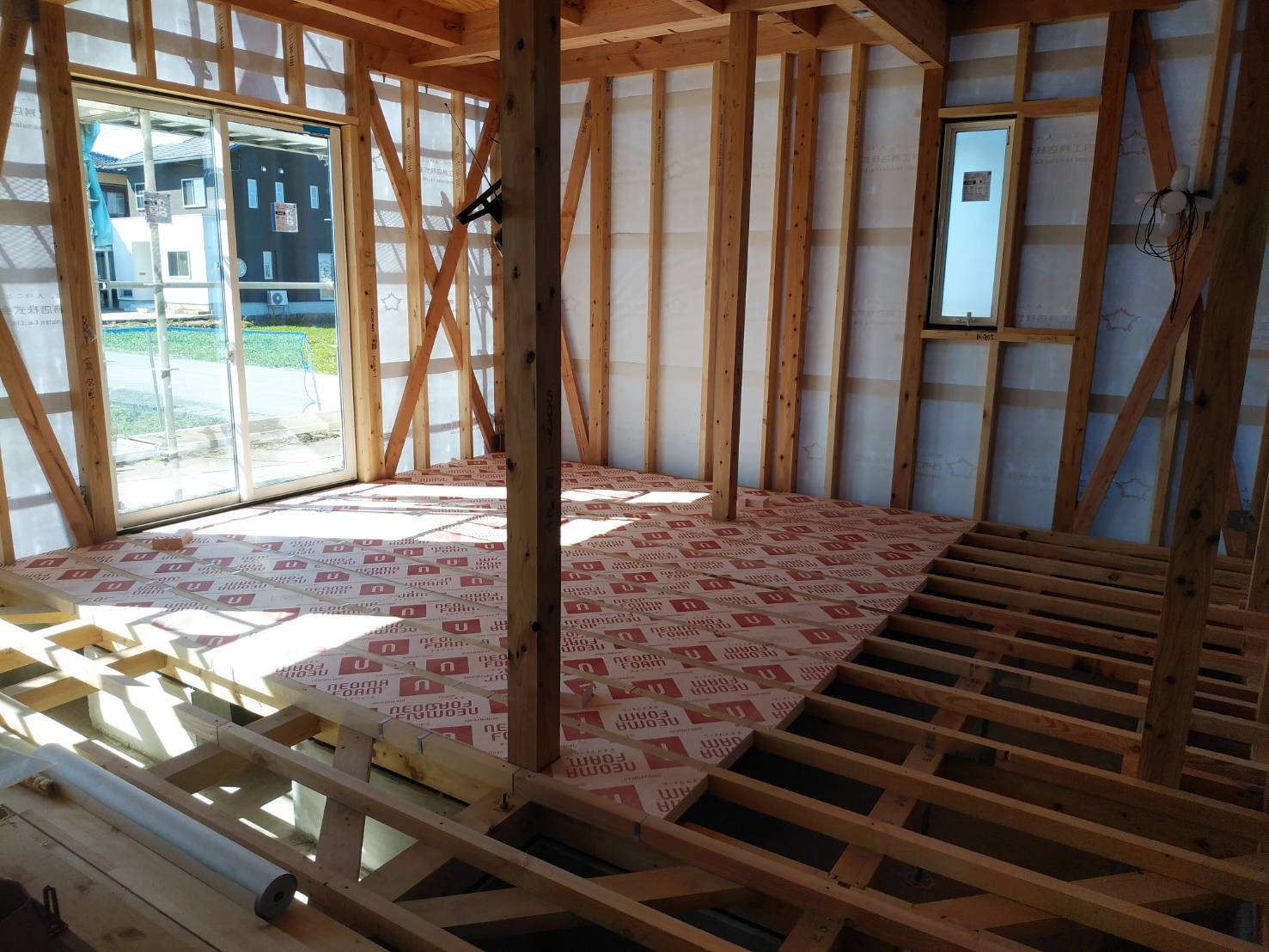 1階の床フロアの施工が始まりました。養生しながらの作業となります。