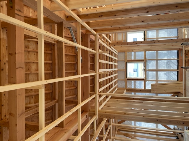 事故怪我なく無事に建て方が終わりました。 全体像が見えてきました。 明日からは筋交いの取付工事がメインとなります。