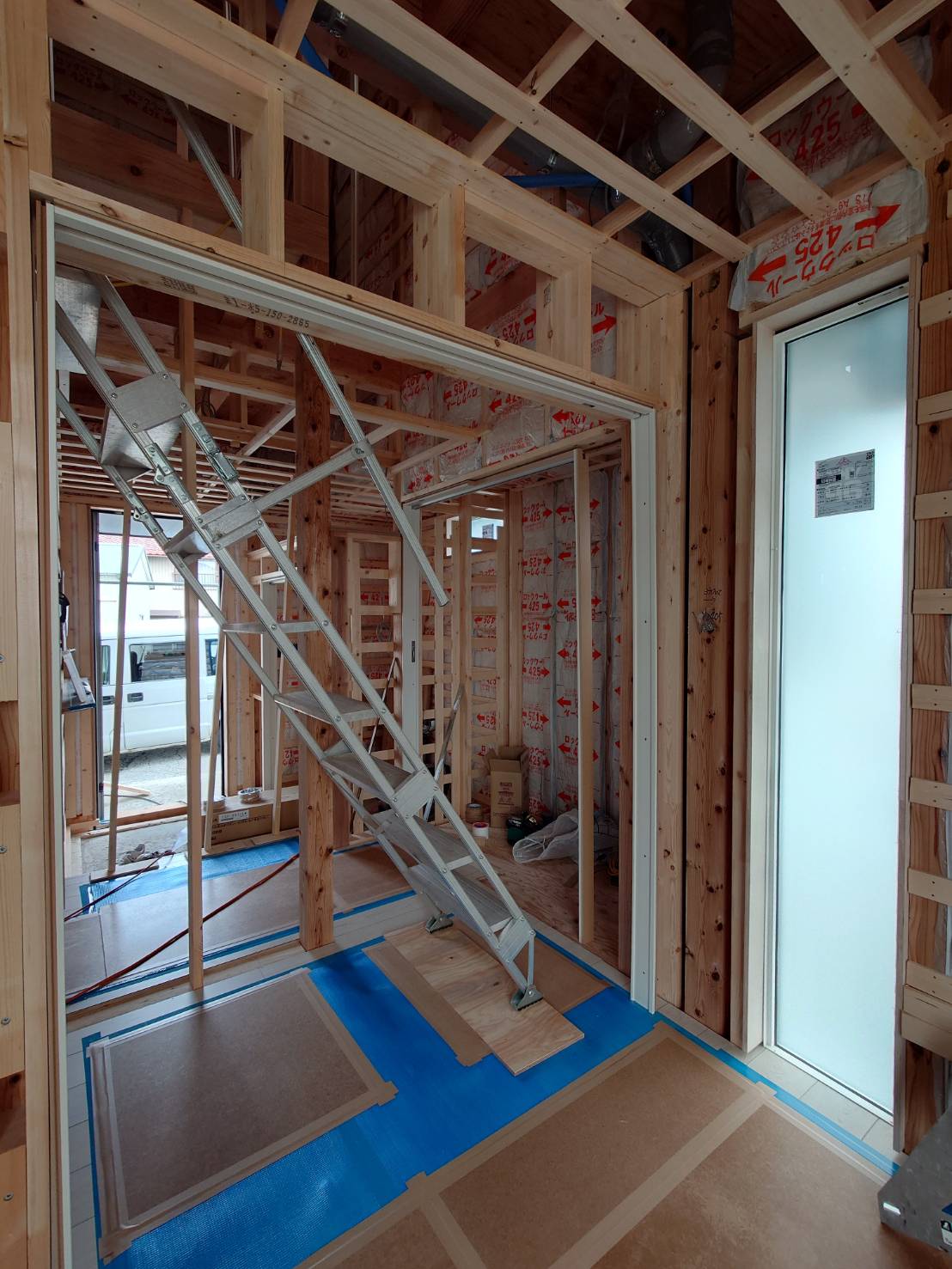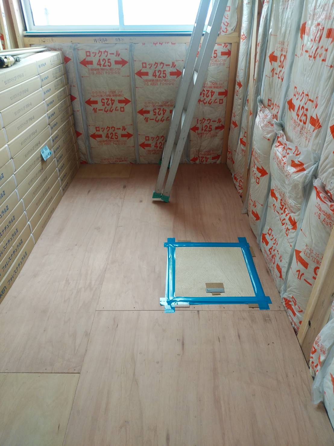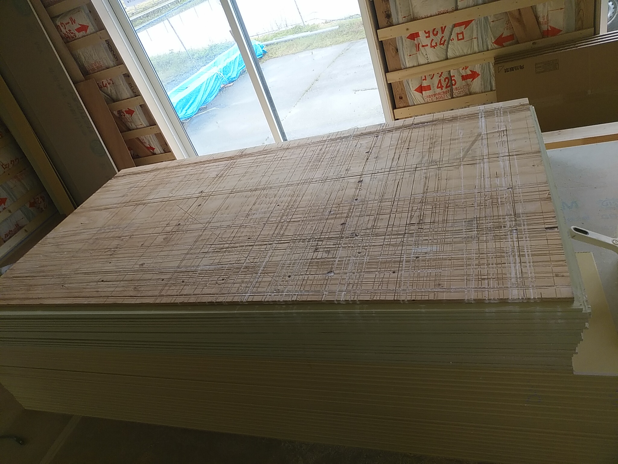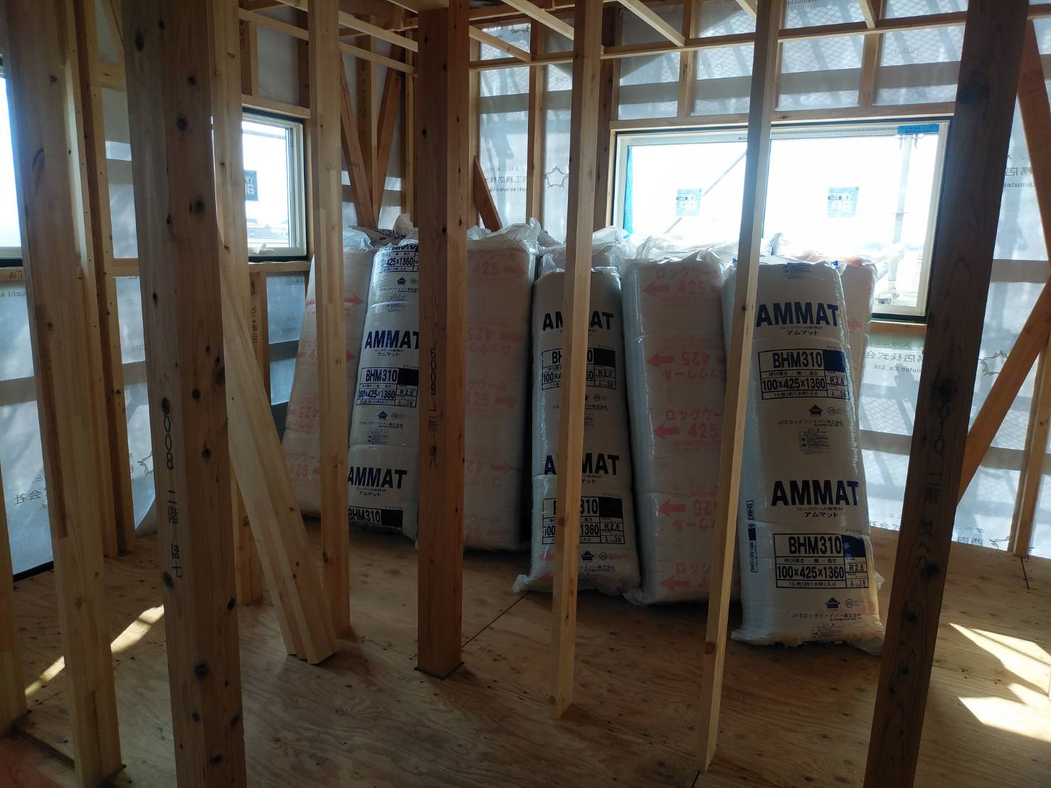 本日午前に2階で使用する断熱材が搬入されました。大工さんと二人がかりで1階から2階に上げたのですが、普段力仕事をしない私は何の力にもなれず、ほとんど大工さんがやってくれました。
