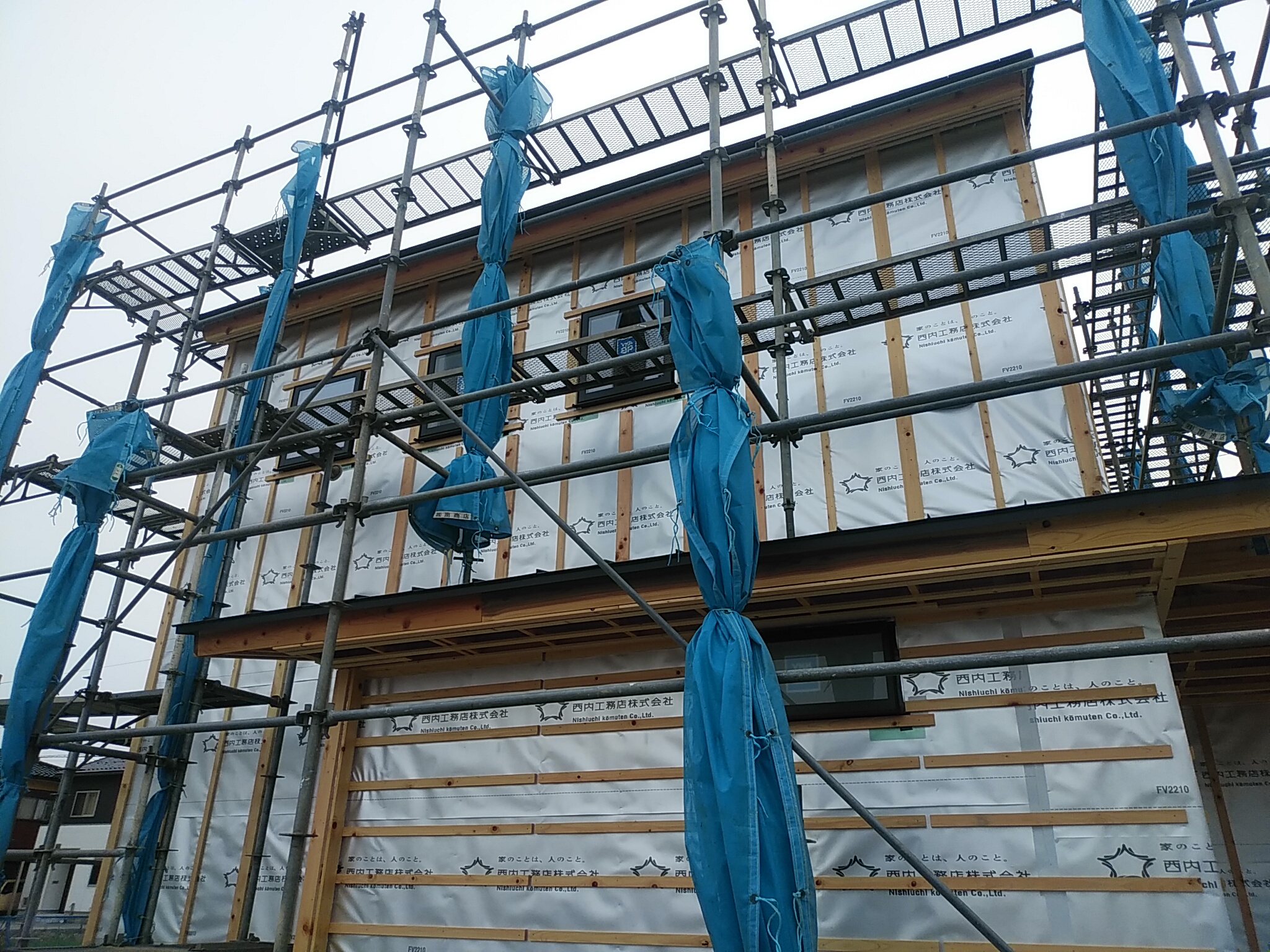 金物取付完了し、15日から予定の外壁施工にむけ外部の下地を施工しております。