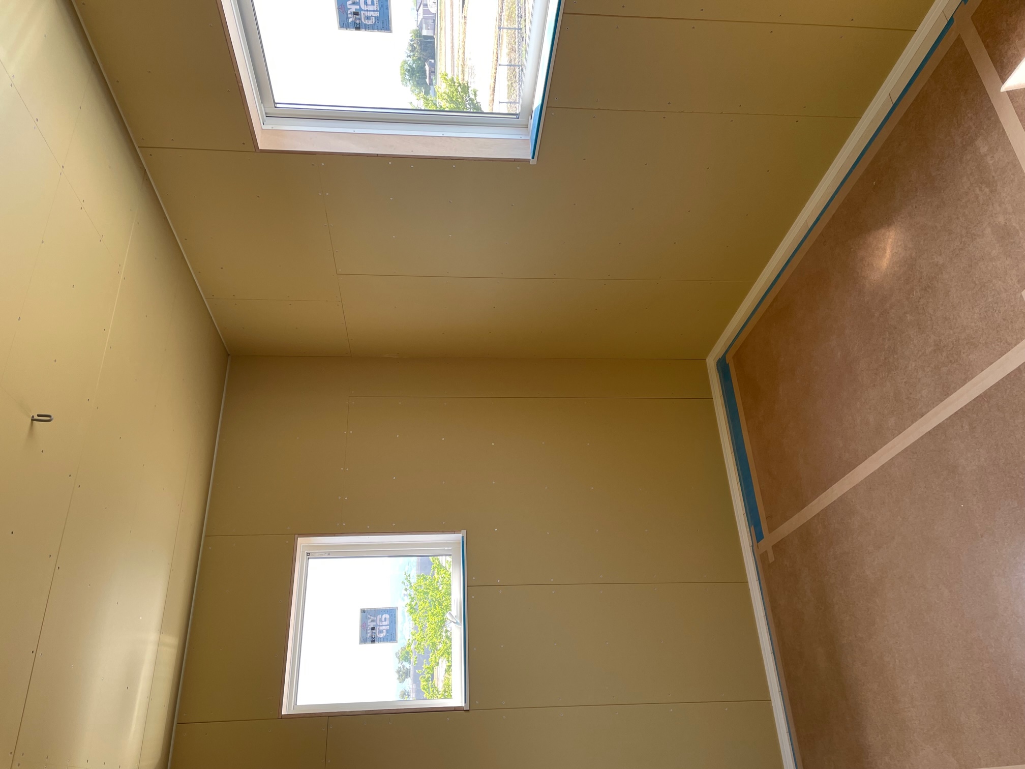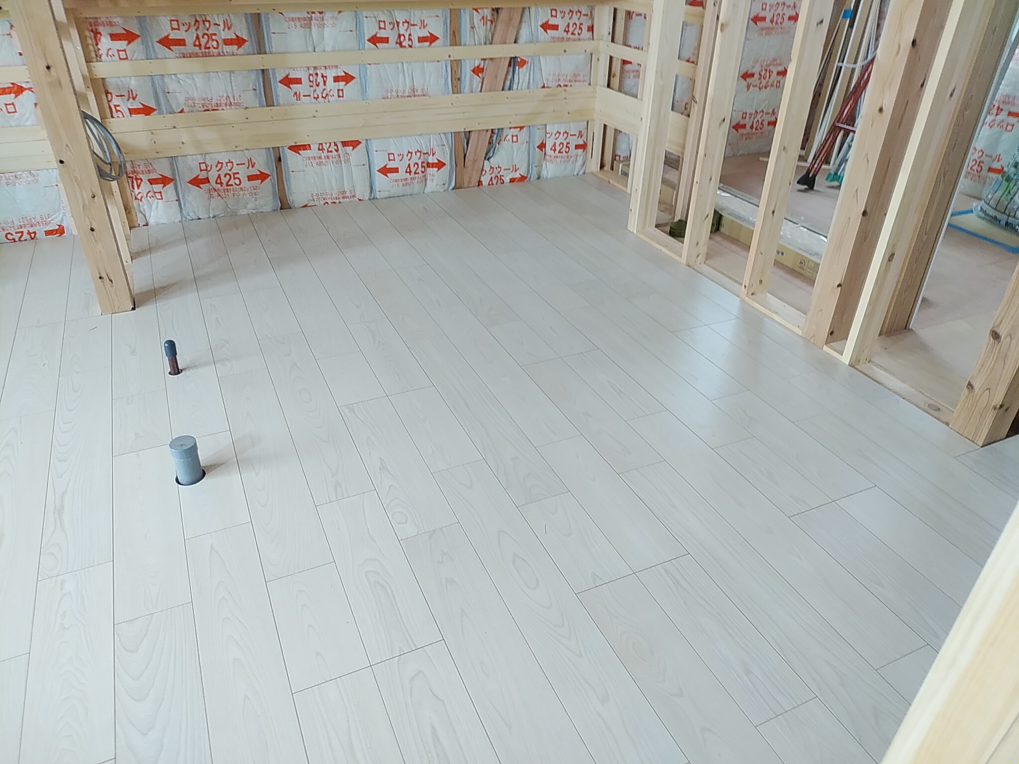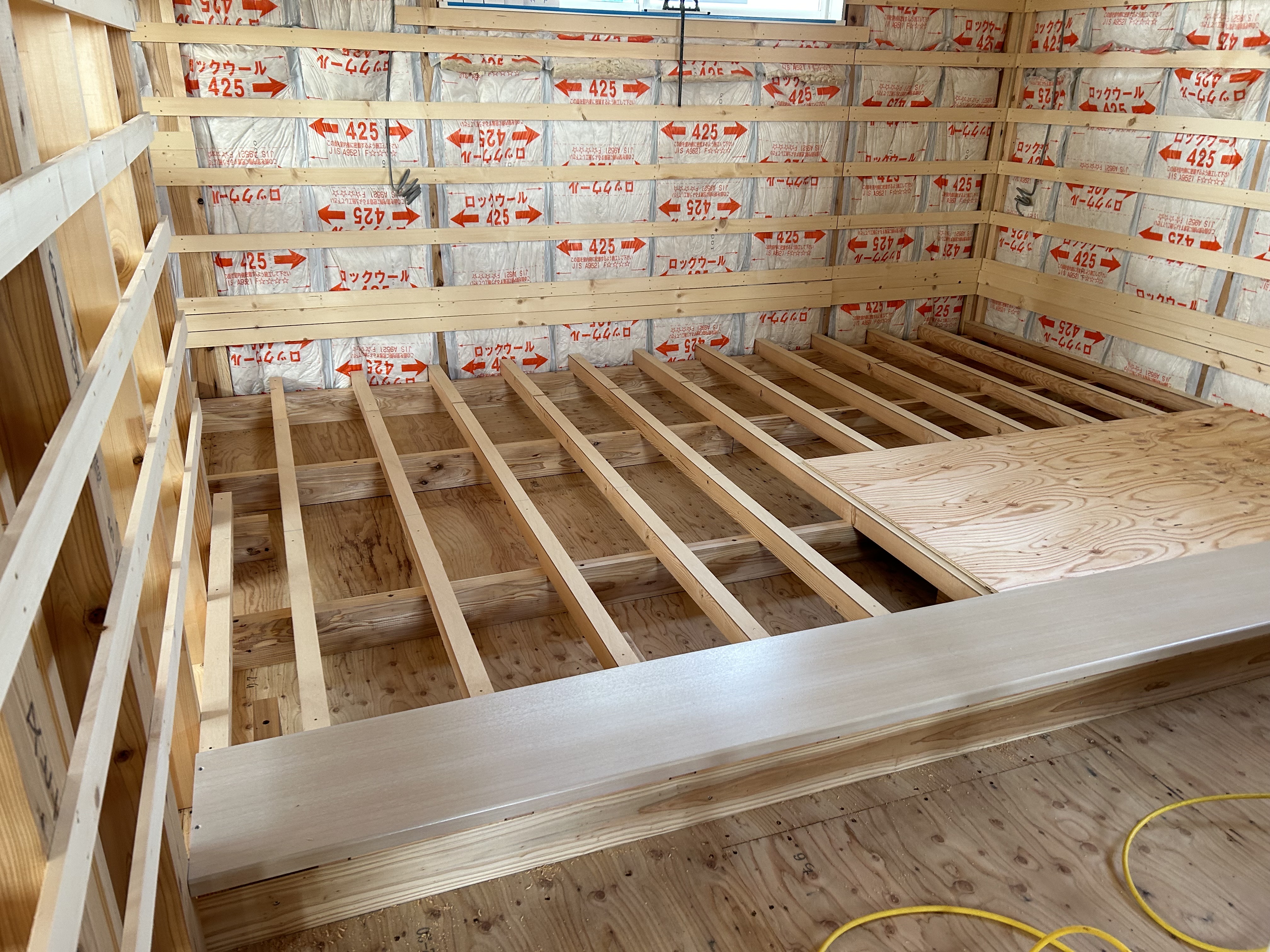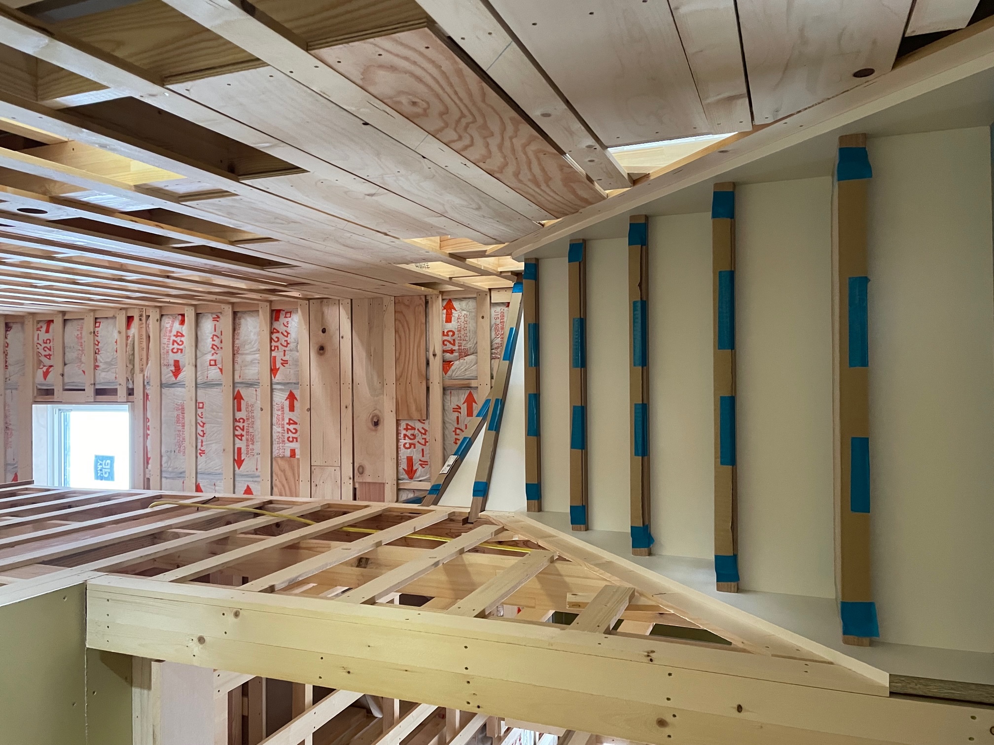 二階にあがってみると、あとはプラスターボードをはるだけの状況になっていました。間仕切りができると家らしく見えてきます!!
