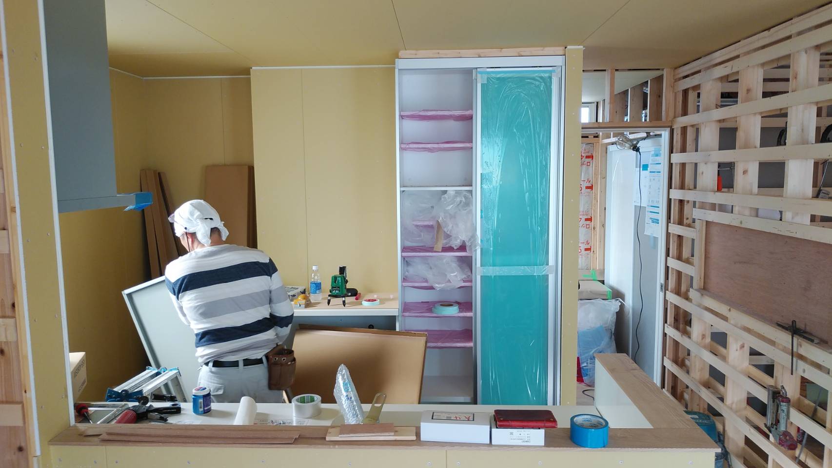 今日は予定通りにシステムキッチンの組立が行われています。 職人様が図面を見ながら、水平器で確認しながら作業を進められていました。