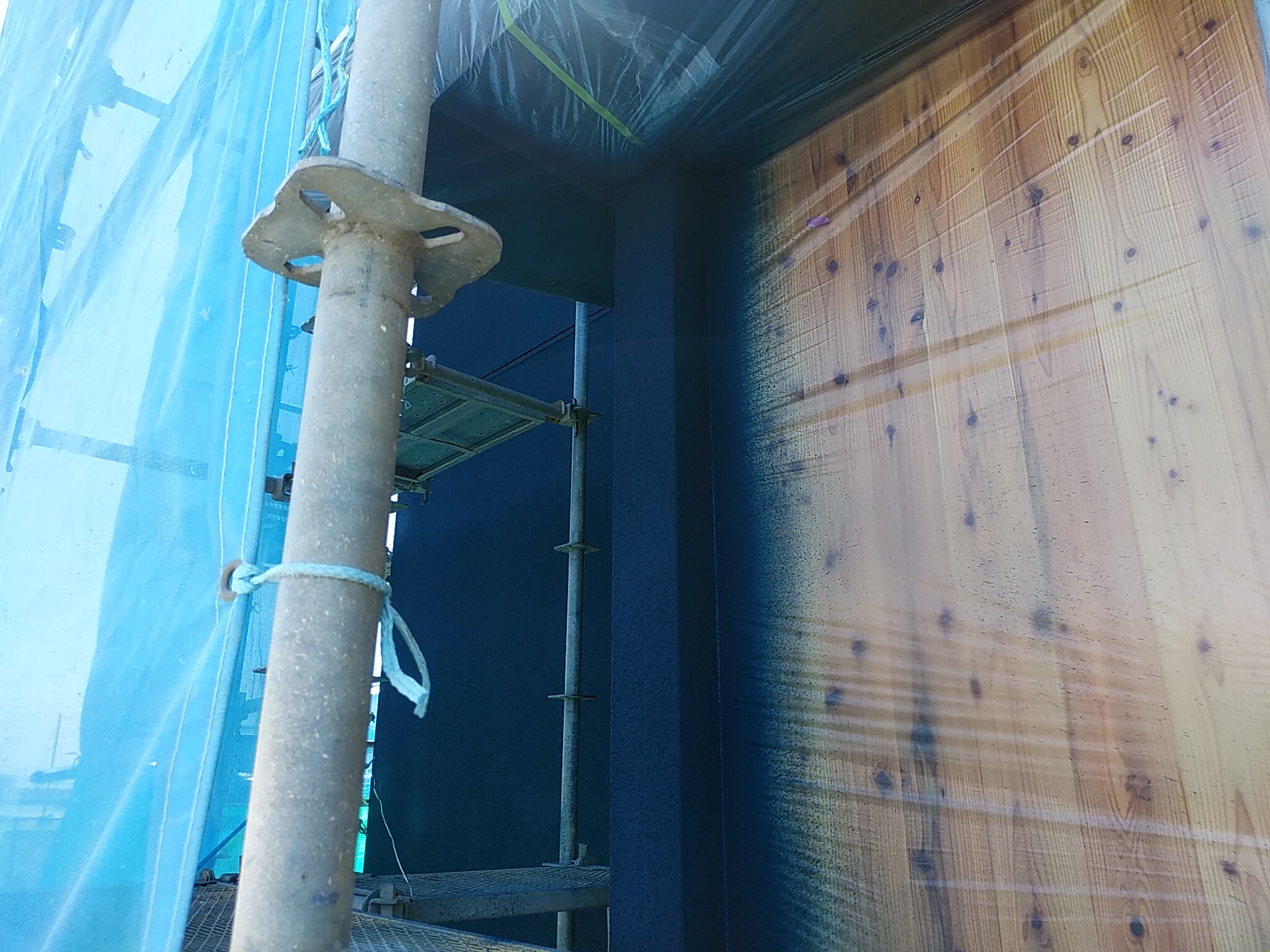 吹き付け工事がおわり、仕上がり具合の確認のため足場のネットをたたみました。 来週足場が取り外される予定です。