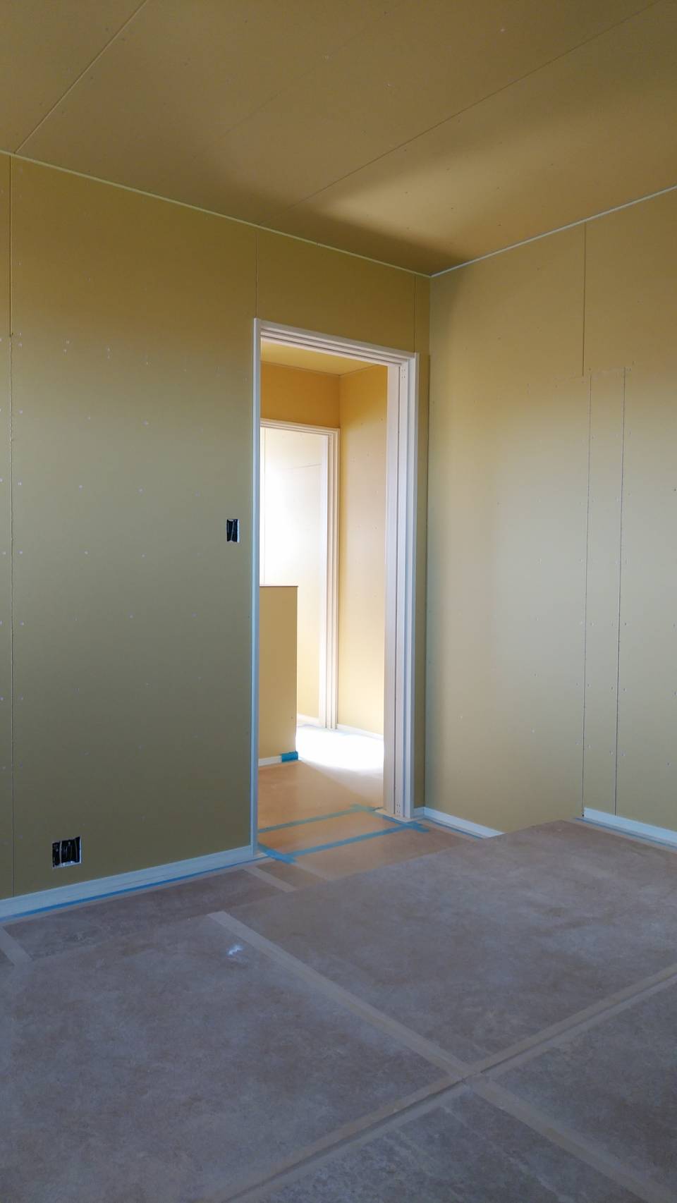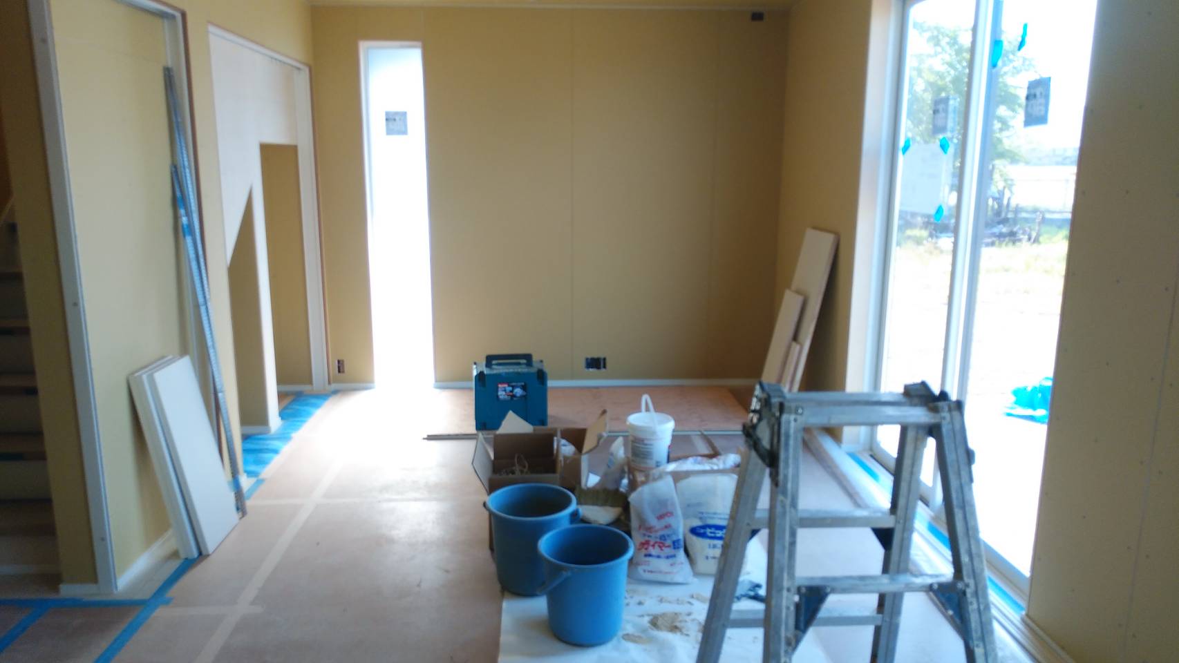 2階のボードが貼り終え、1階のボードが大詰めです。 造作材の塗装工事の準備も行っております。