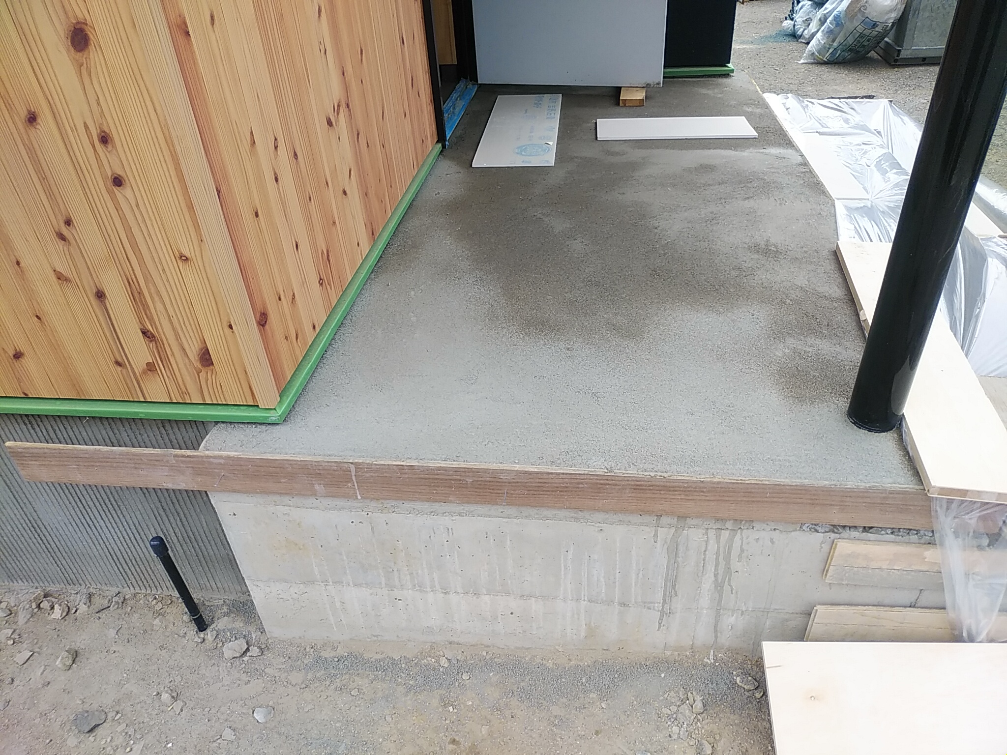 玄関廻りではタイル下地が施工されました。 丸柱は仕上げ塗装が終わっております。