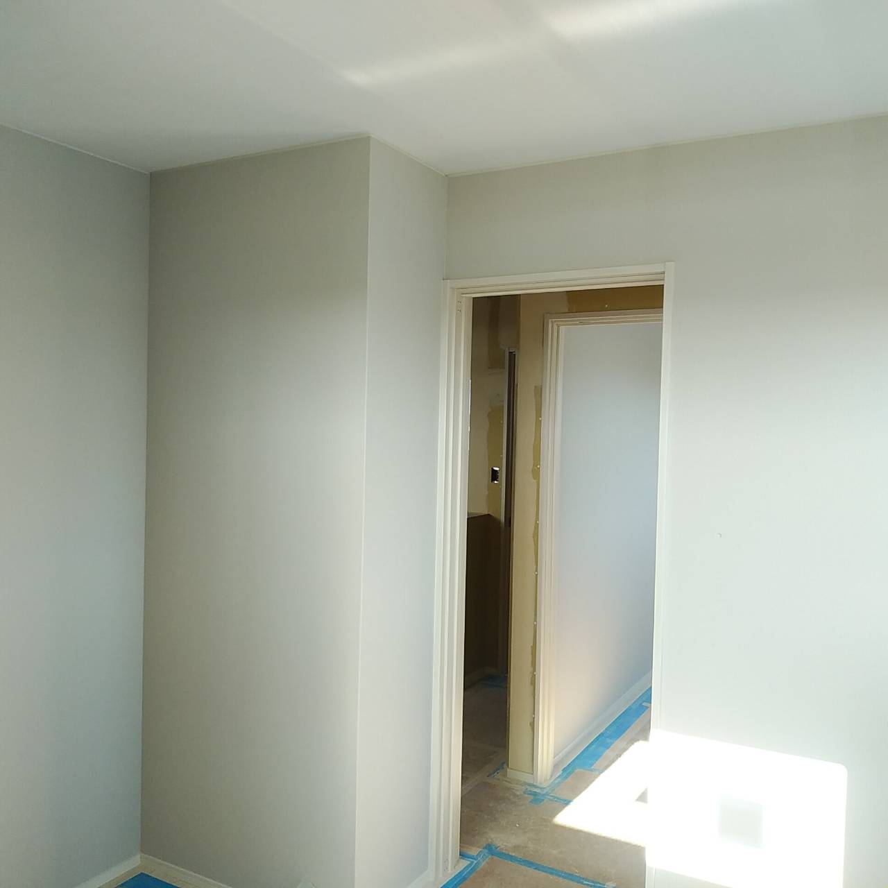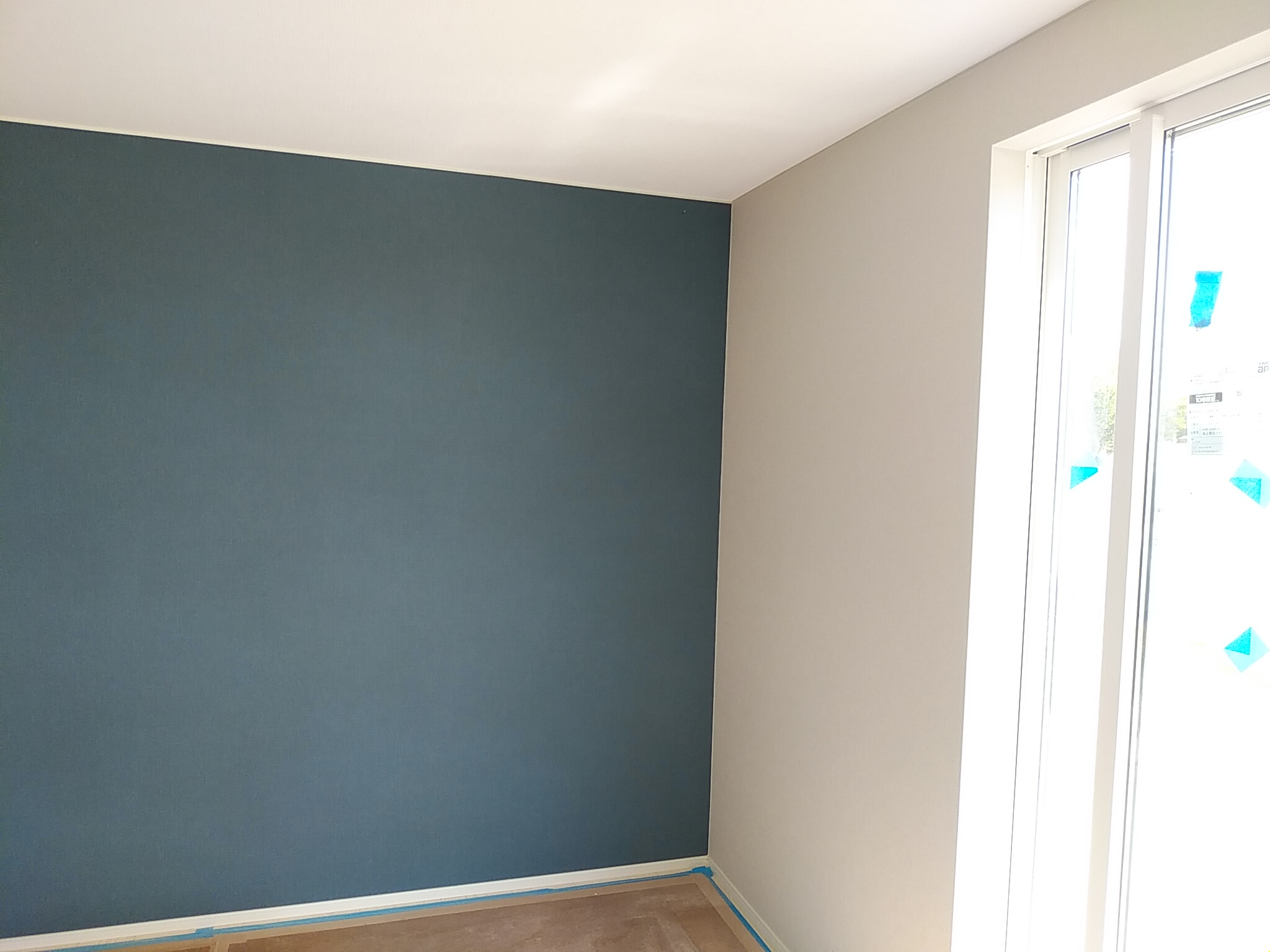 昨日午前に大工さんの工事が完了し、午後よりクロス貼りに向けて下地ボードの継ぎ目を埋めるパテ塗の作業に着手しています。