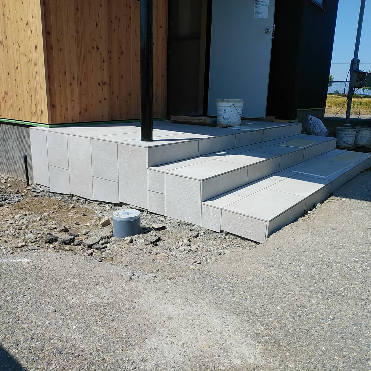 玄関部分のタイル貼り工事を行っております。 しばし、立ち入り禁止となるため、内部の職人様はリビングの窓から出入りされてました・・・笑