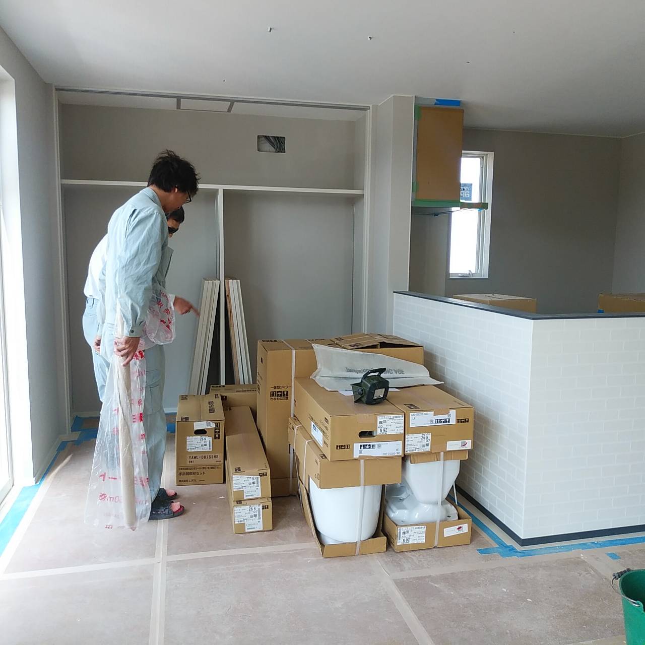 クロス工事が終わり本日よりトイレ等の器具付け工事に着手します。 問屋さんから搬入された器具を眺めながら段取りをしている様子です。