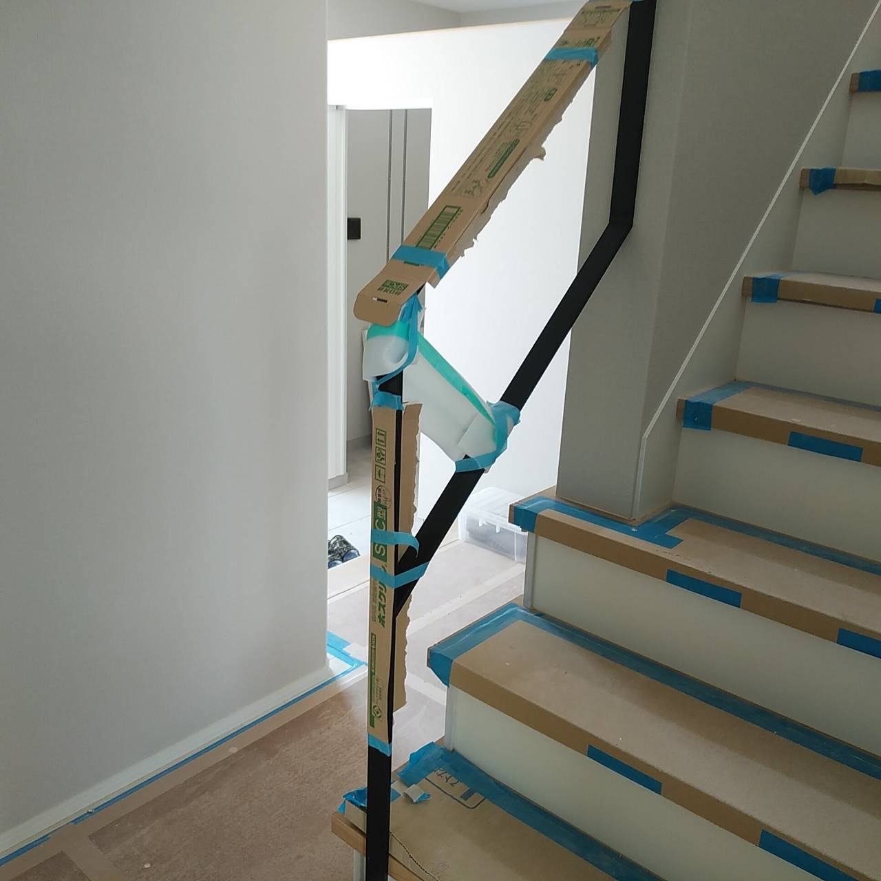 階段上り口の金属製の手すりも取り付けが完了しております。 細かなキズが付かないように養生されています。