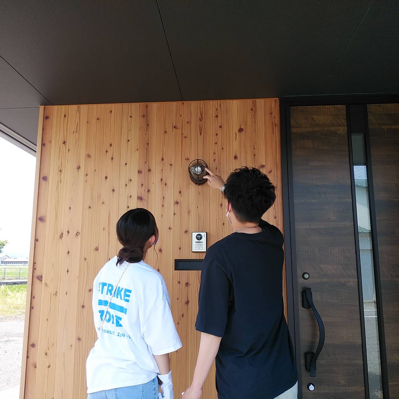 玄関廻りのアクセントとなる木製外壁を施工しております。 自然素材が目をひきますね。