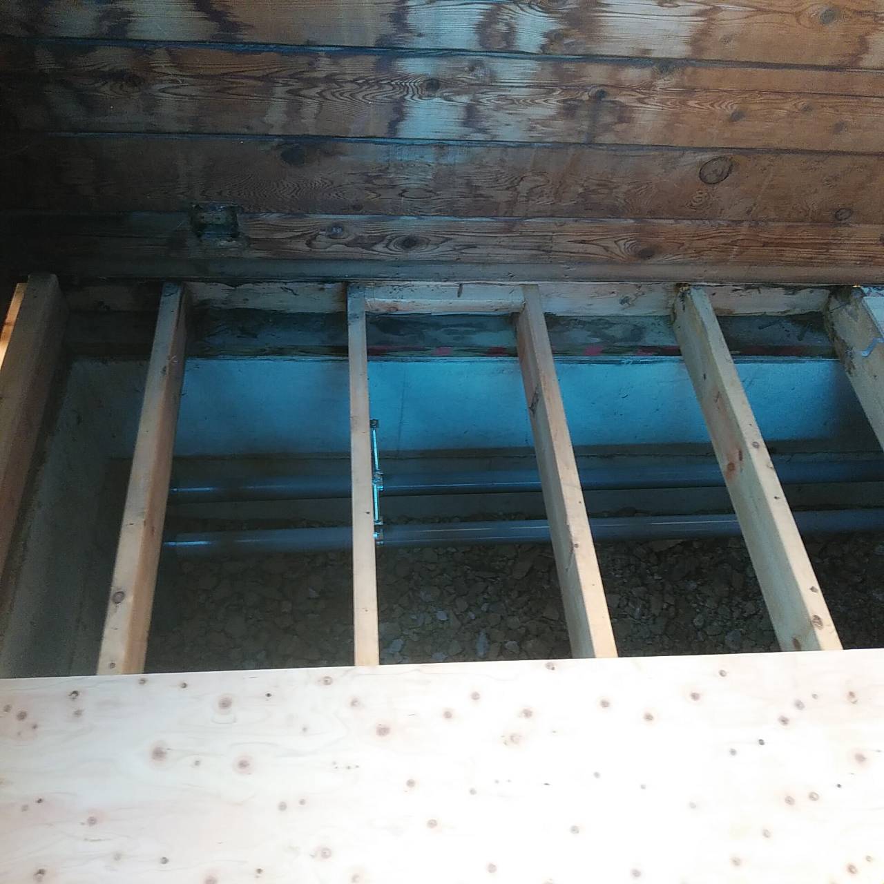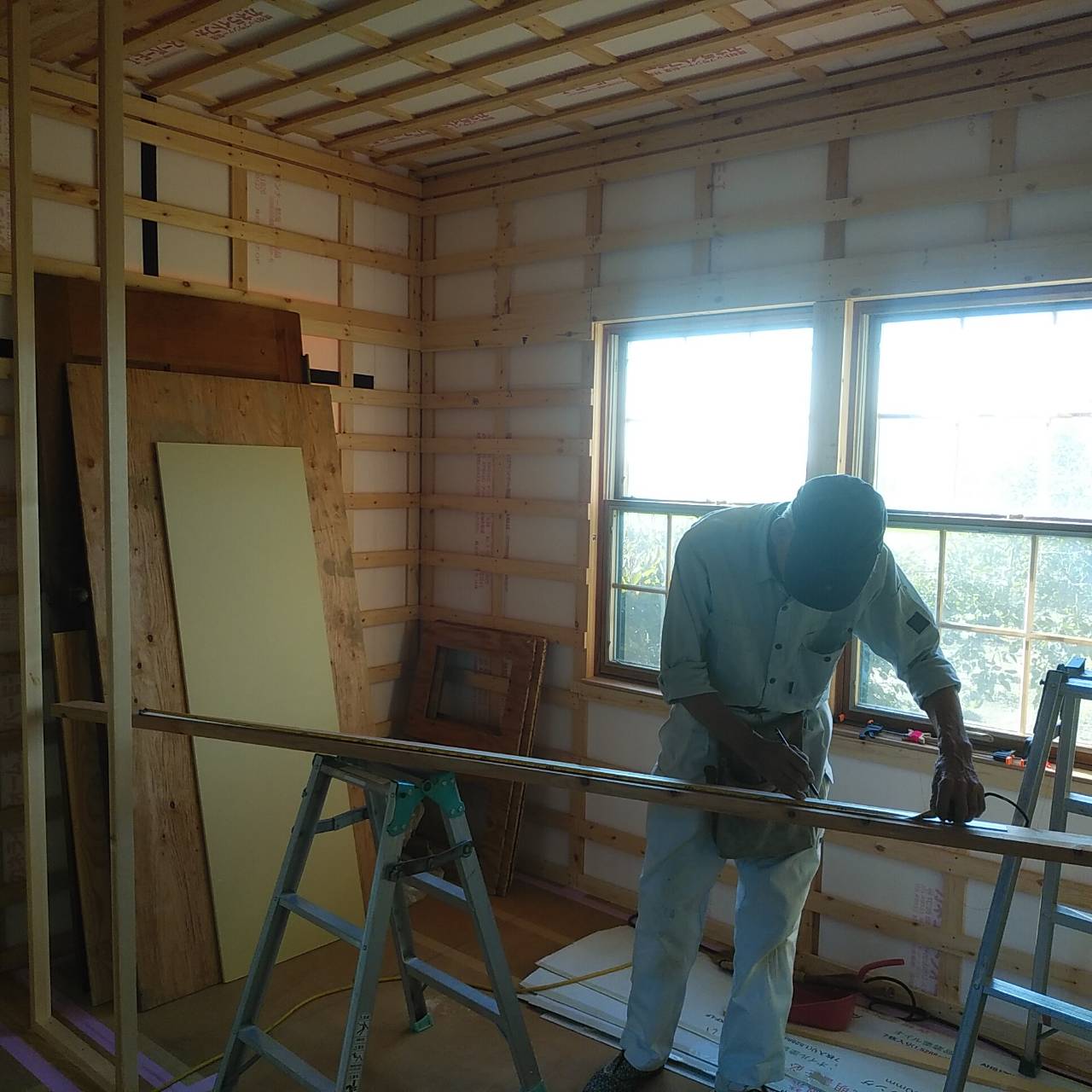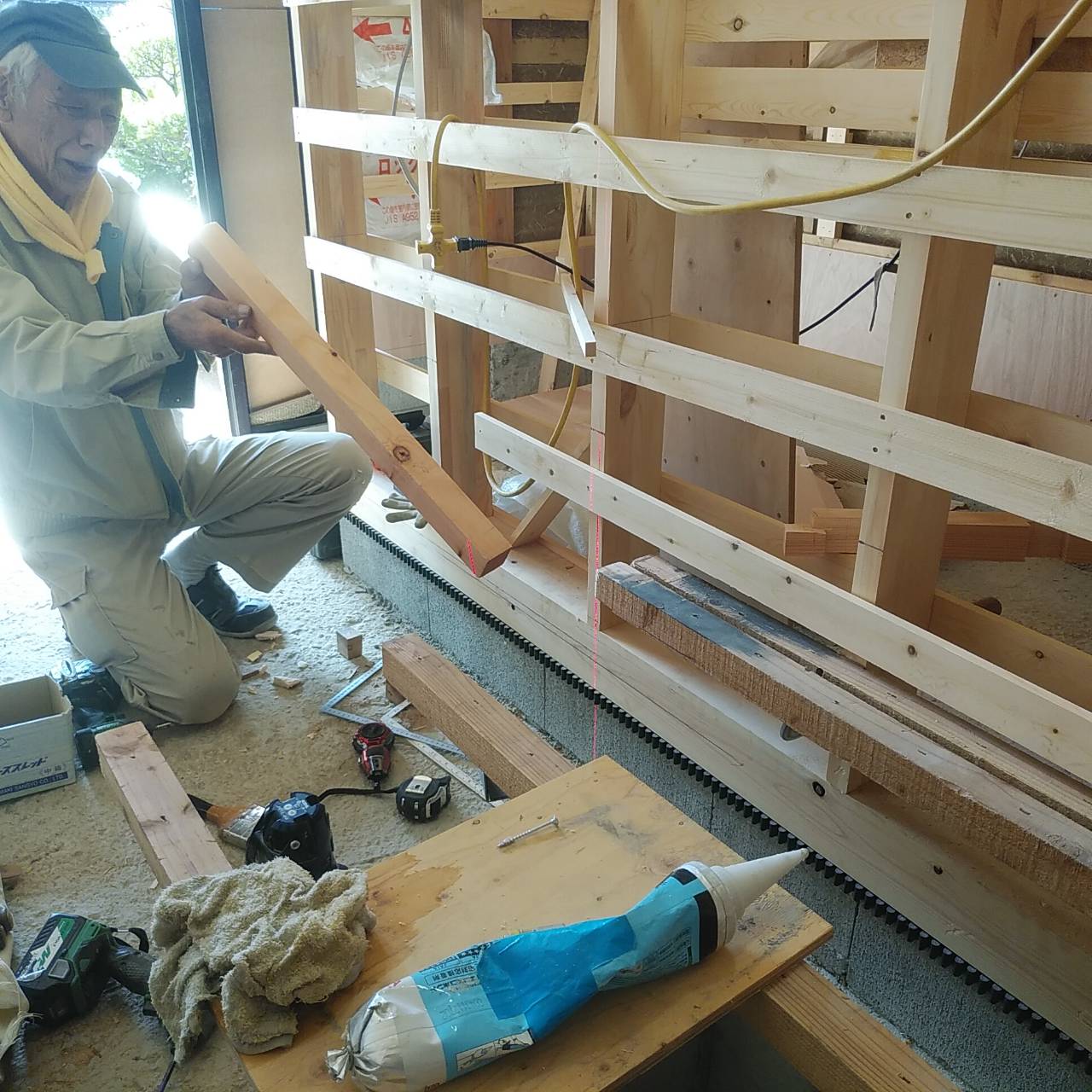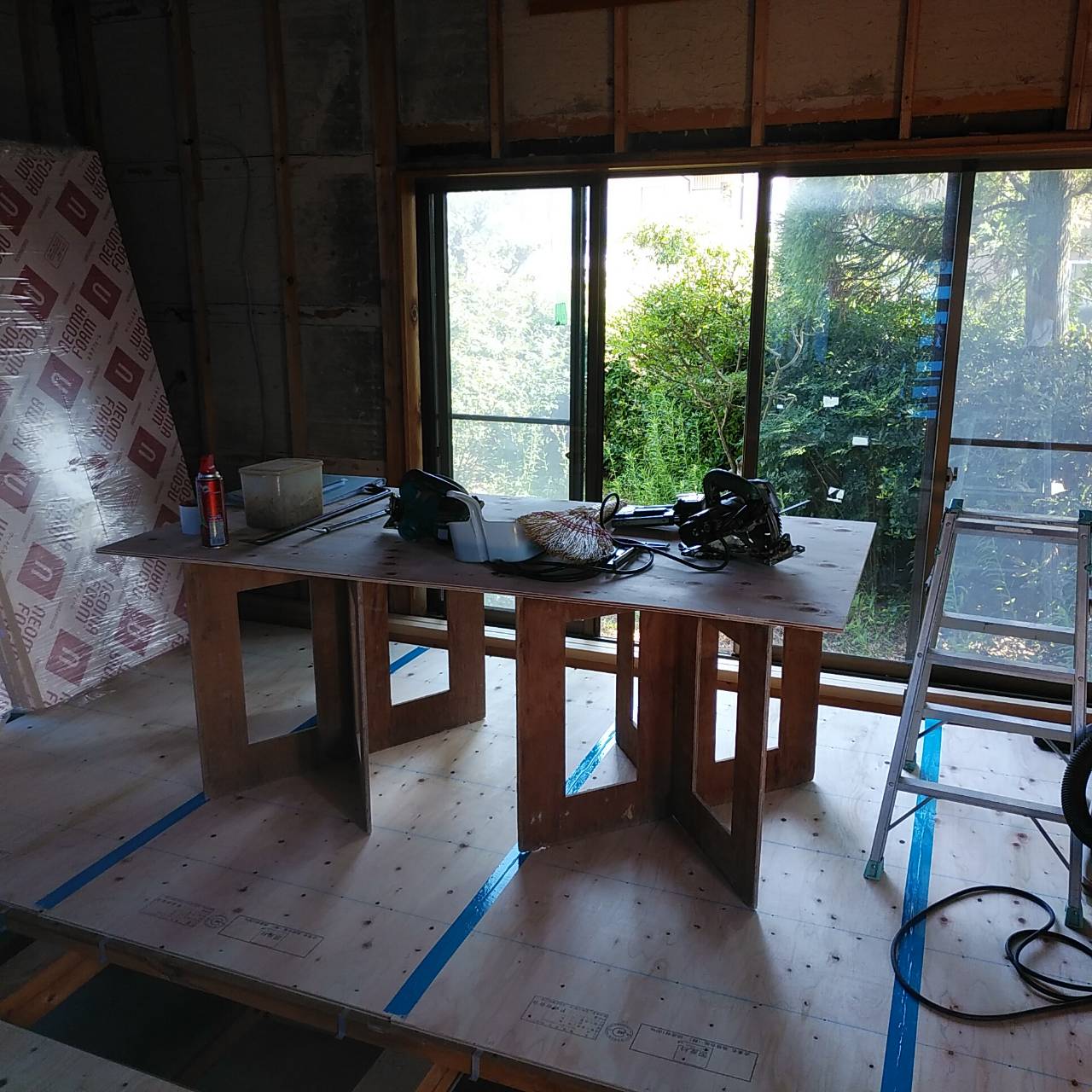 先週より大工さんの工事が始まっています! まずは床タルキの補修を行いながら、合板を貼っていく作業となります。