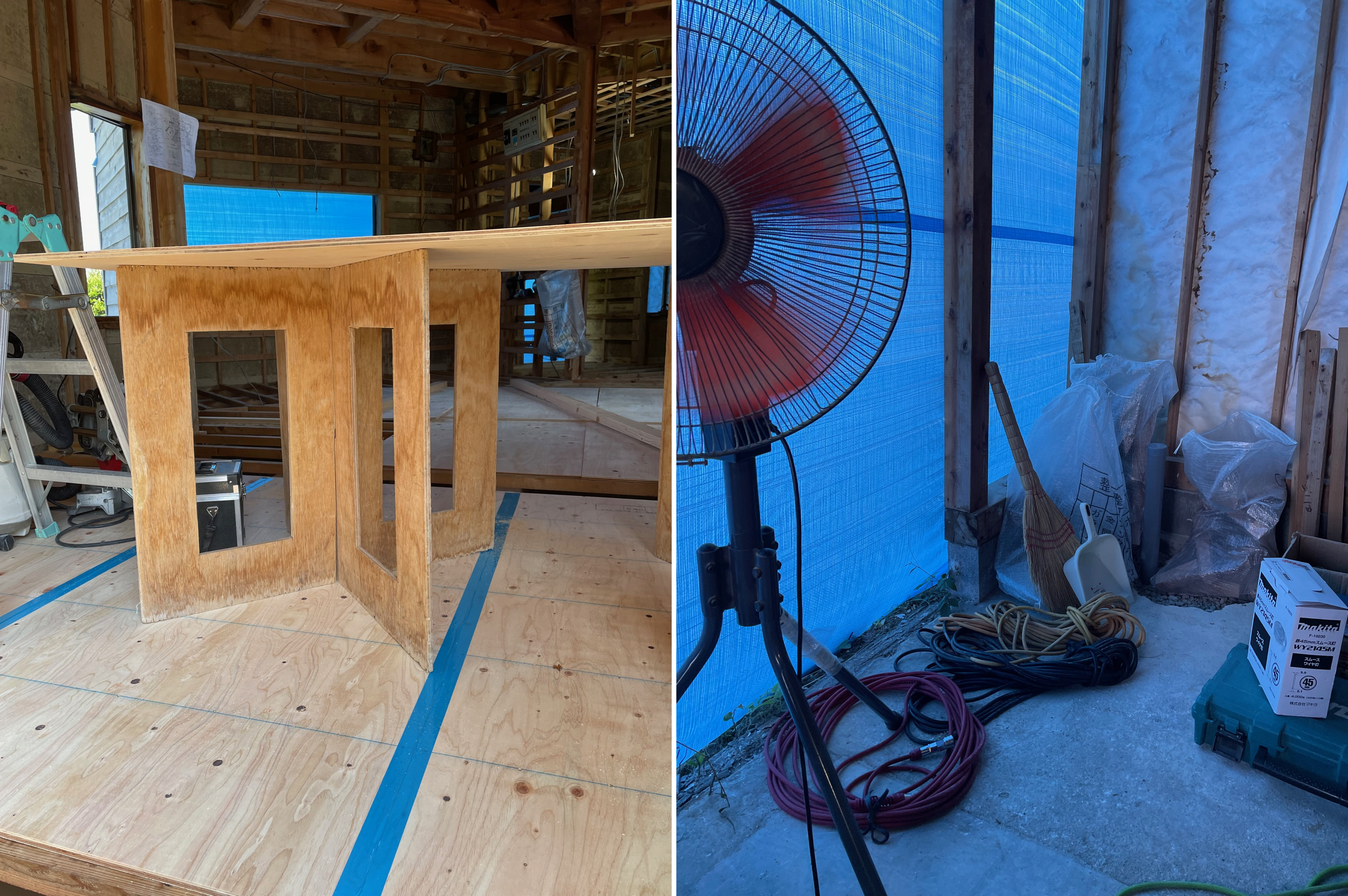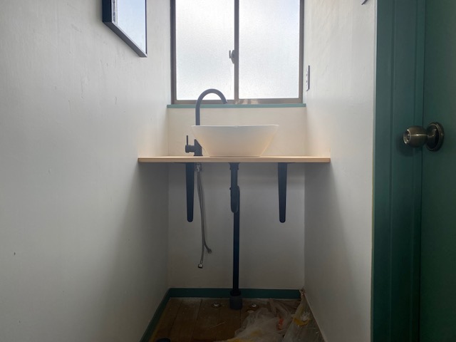キッチンのカップボード設置に向けて壁の下地、仕切りなどの工事が完了しました。