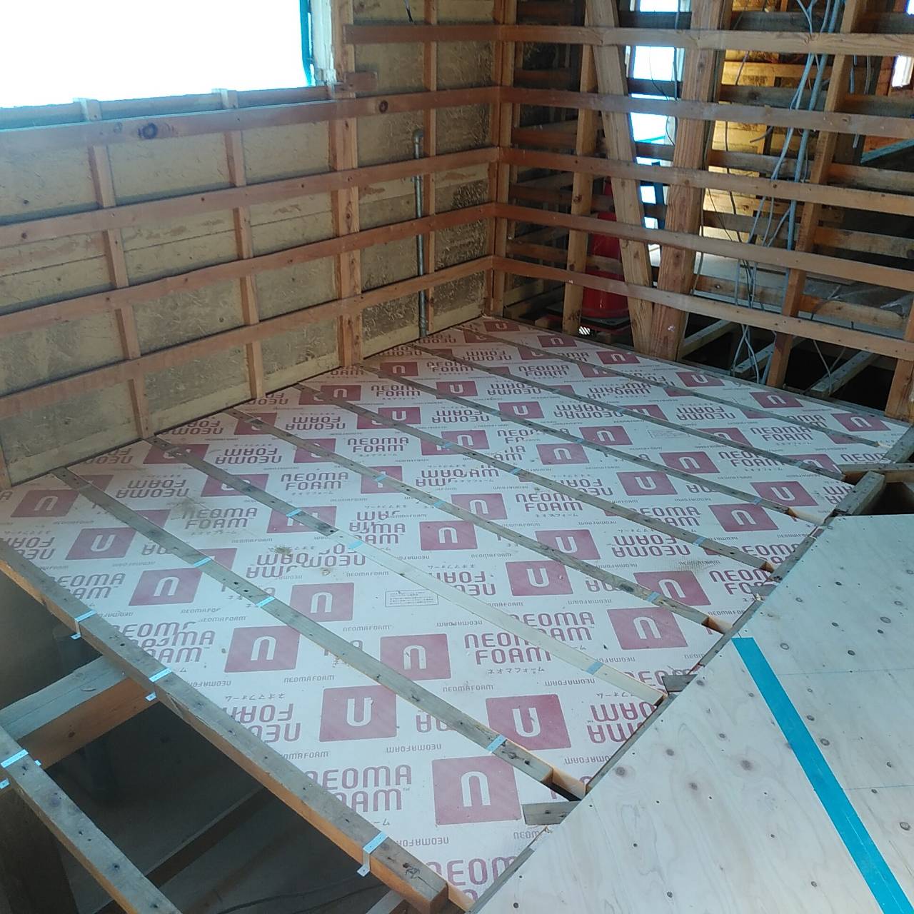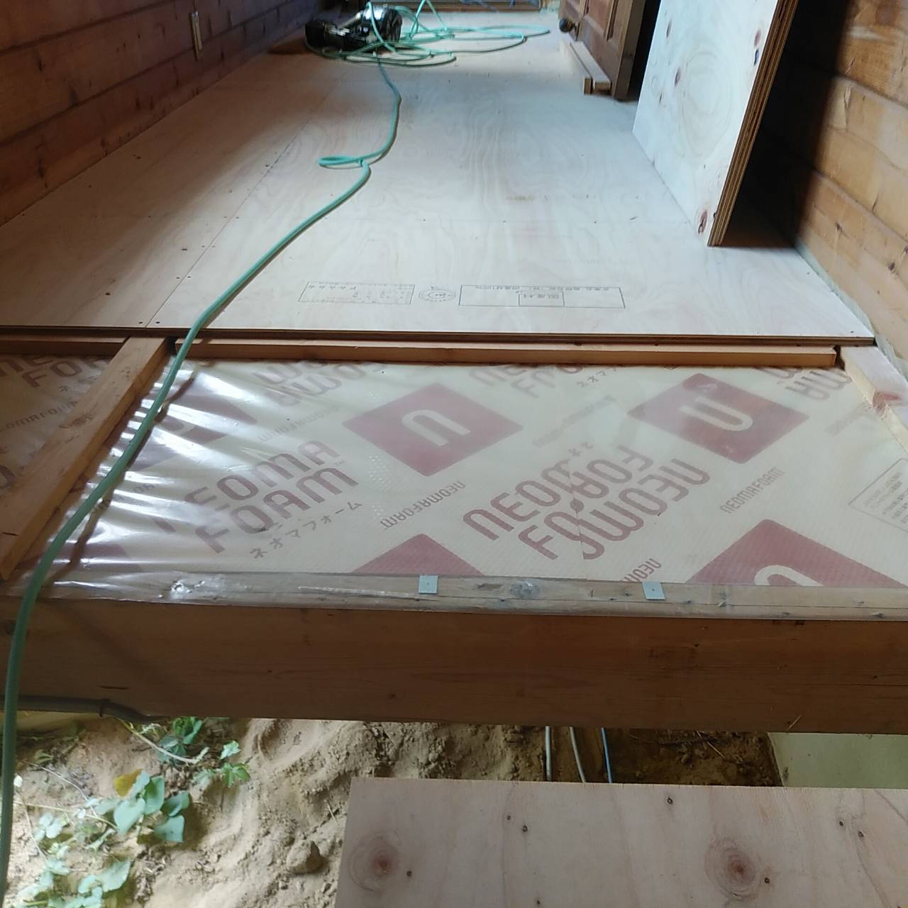 床の断熱材の敷設が完了するごとに下地板を貼り、足場を確保しています。