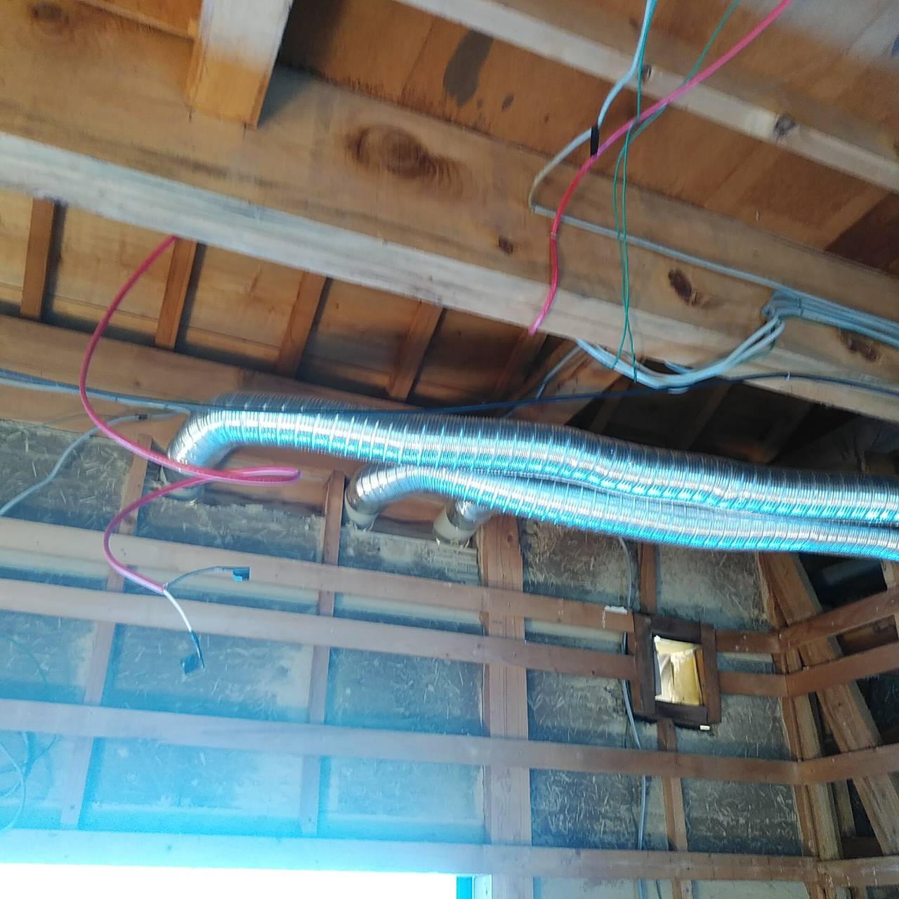 水廻り関係のお部屋の換気扇の排気ダクトとなります。 天井を塞ぐ前にしっかりと取り付けを行っていきます。